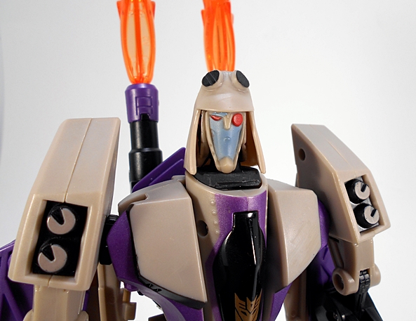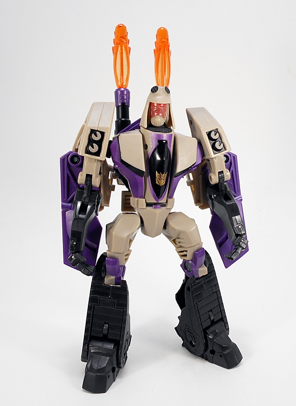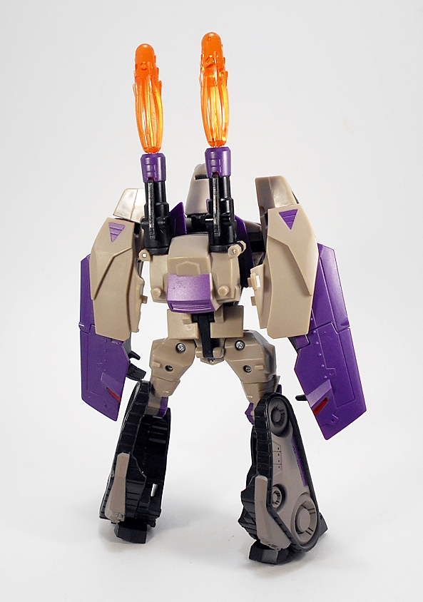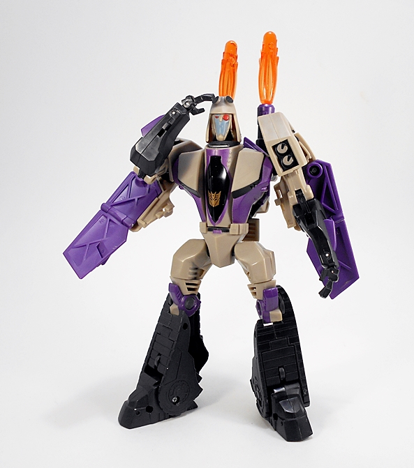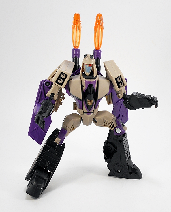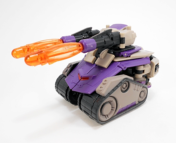 And then there’s Blitzwing’s other alternate mode. If you’re expecting anything resembling a real tank, you’ll be woefully disappointed. This form is a tank only in the sense that it has treads and a turret. It’s hard to figure whether this is supposed to be some kind of futuristic tank in the animated style, a Cybertronian tank, or just a super-deformed mess. That having been said, there are some cool things at play here, like the way the jet’s wings form the plating on the tank’s body. Images have these two pieces fitting together flush, but mine always seems to leave a gap. The guns and missiles are made up of the jet’s thrusters, cast in translucent orange plastic. The turret turns and the missiles shoot, but it does not raise or lower.