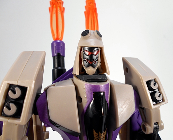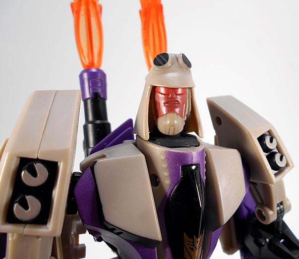 His backpack, which is made up of the tank’s turret, can be positioned in a few different ways. Point the missiles up, or turn them facing down for a nice looking jetpack. You can also space them further apart so that they protrude less and are closer to his shoulders. I’ve shot him using both configurations, but I think the later is my favorite. The obvious thing missing here is any weapons. Blitzwing doesn’t come with a gun and his missile launchers can’t really be positioned in a way to fire from his back. I suppose if you can turn into a tank, you don’t need any weapons, but still. A Decepticon without some kind of gun or arm cannon just doesn’t feel right to me.