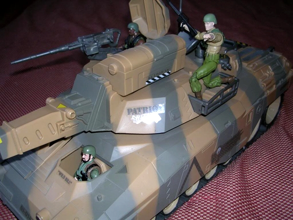 One of the coolest things about the Patriot Grizzly is its electronics. There’s a handle concealed in the back tha folds out like a joystick. Using this control you can rotate the turret left and right, move the tank forward and backwards, and rapid fire the huge stock of missiles that are fed into the main gun from the hatch on the main turret. Just about every movement the tank makes is accompanied by nice sound effects. The engine rumbles, the treads squeal, and the machine gun fires off bursts. It’s lots of fun to take this baby for a spin and it usually sends my cat running for cover.