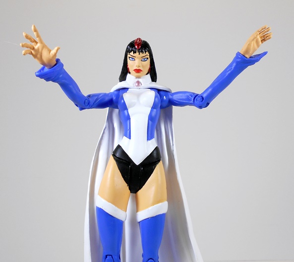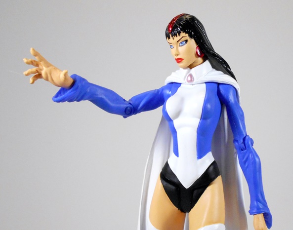 The sculpting on the sleeves is quite nice as they feature hanging cuffs, which give her a certain wizardly look. The cape, collar and neck broach are all sculpted in soft, rubbery plastic and hang off the back rather nicely without throwing off the balance of the figure. I imagine the cape would be removable via popping off the head, but it’s not something I’m willing to try. The boots have a nice glossy blue sheen to them and the high heels strike a nice balance between looking good and actually allowing the figure to stand. They certainly look a lot nicer than the chunky grandma clogs that Mattel’s DCUC version of the character is wearing.