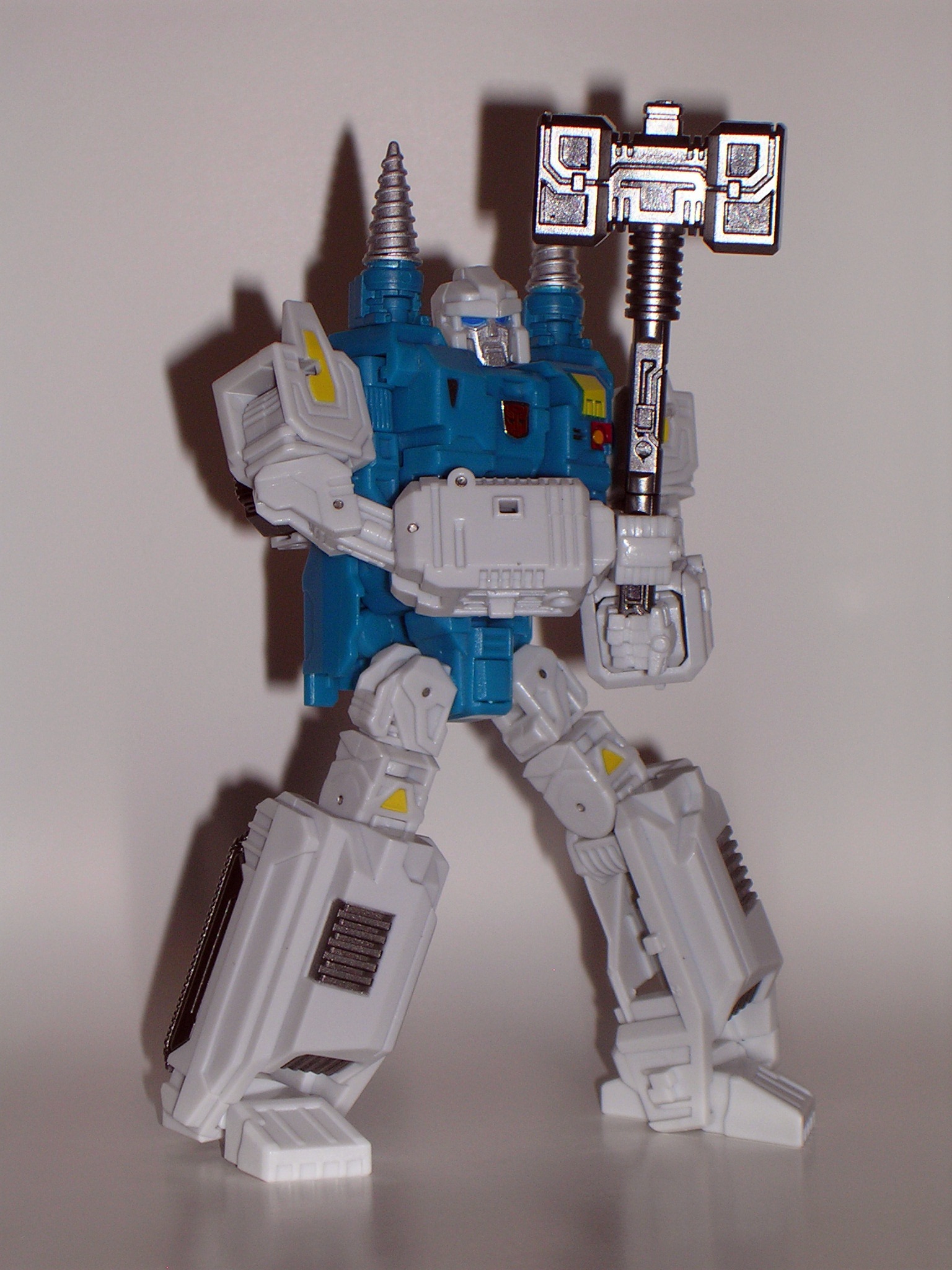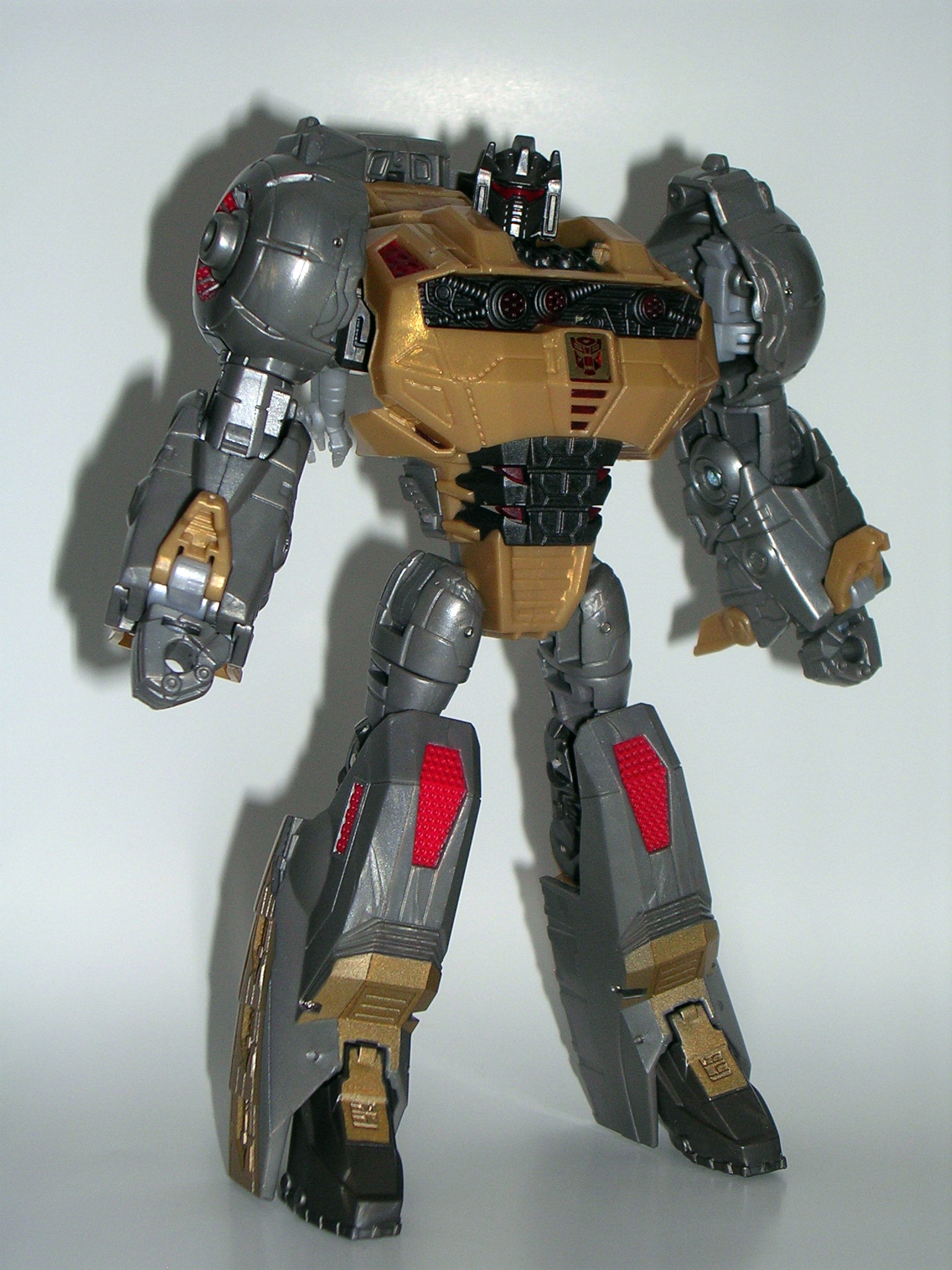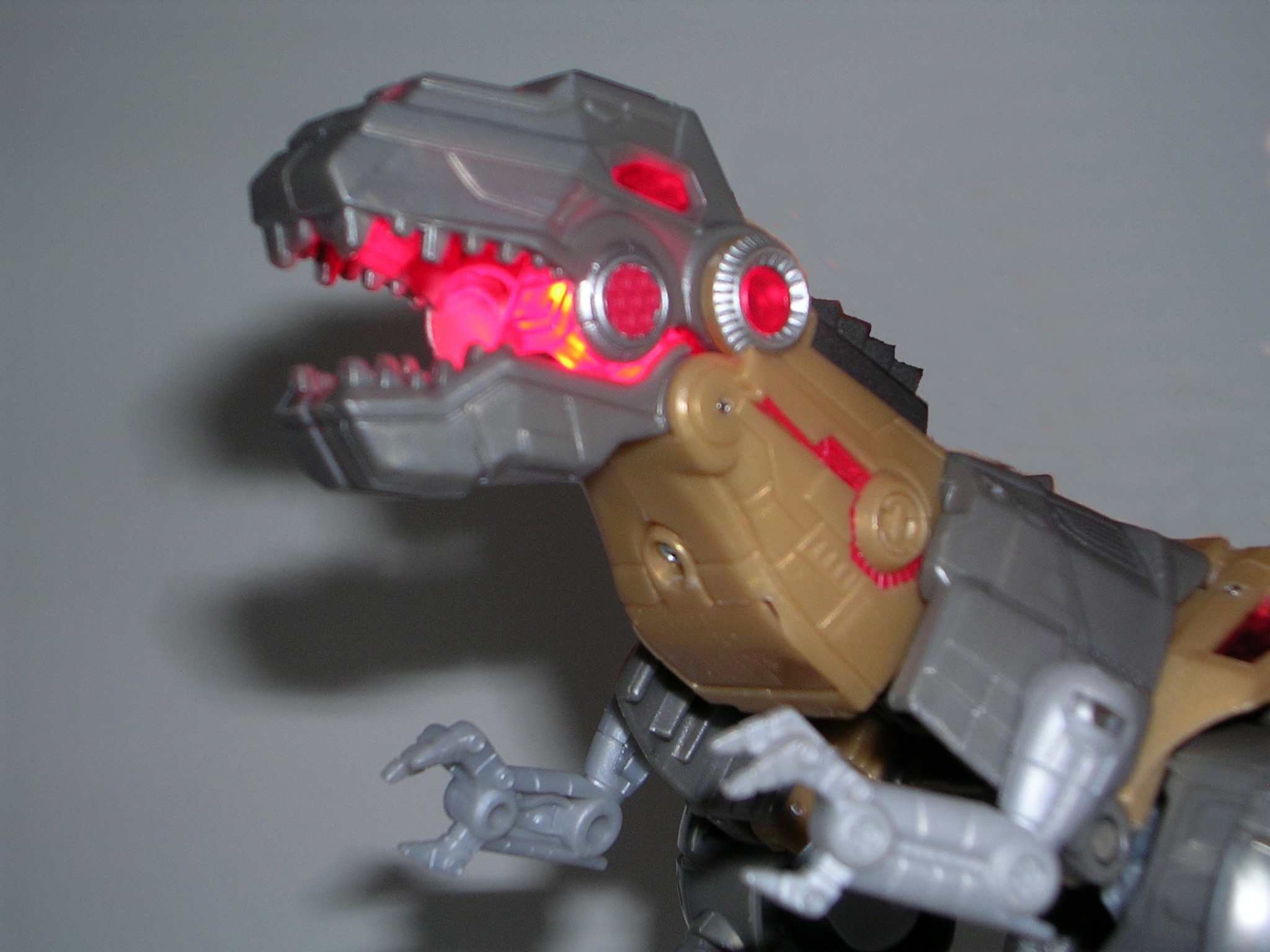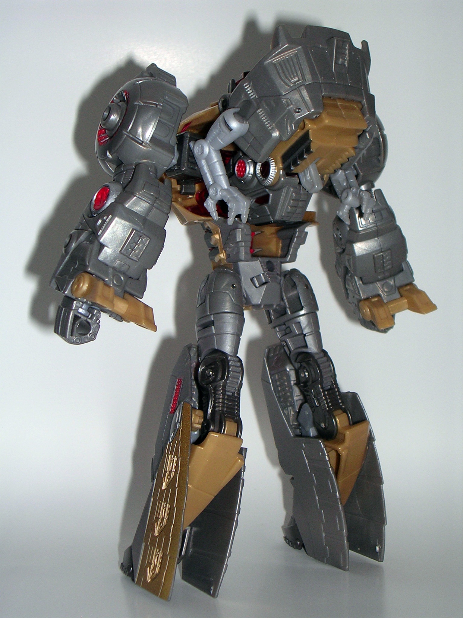 In robot mode, Grimlock features great articulation. His head is ball jointed; his arms rotate at the shoulders and have some lateral movement as well. The elbows are hinged and there are swivels in his biceps and wrists. He legs are ball jointed at the hips, his knees have solid ratchet joints, and there are swivels in his thighs. A waist swivel would have been nice, but what we got is pretty good.