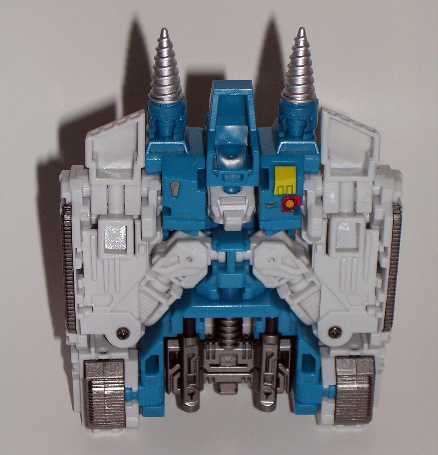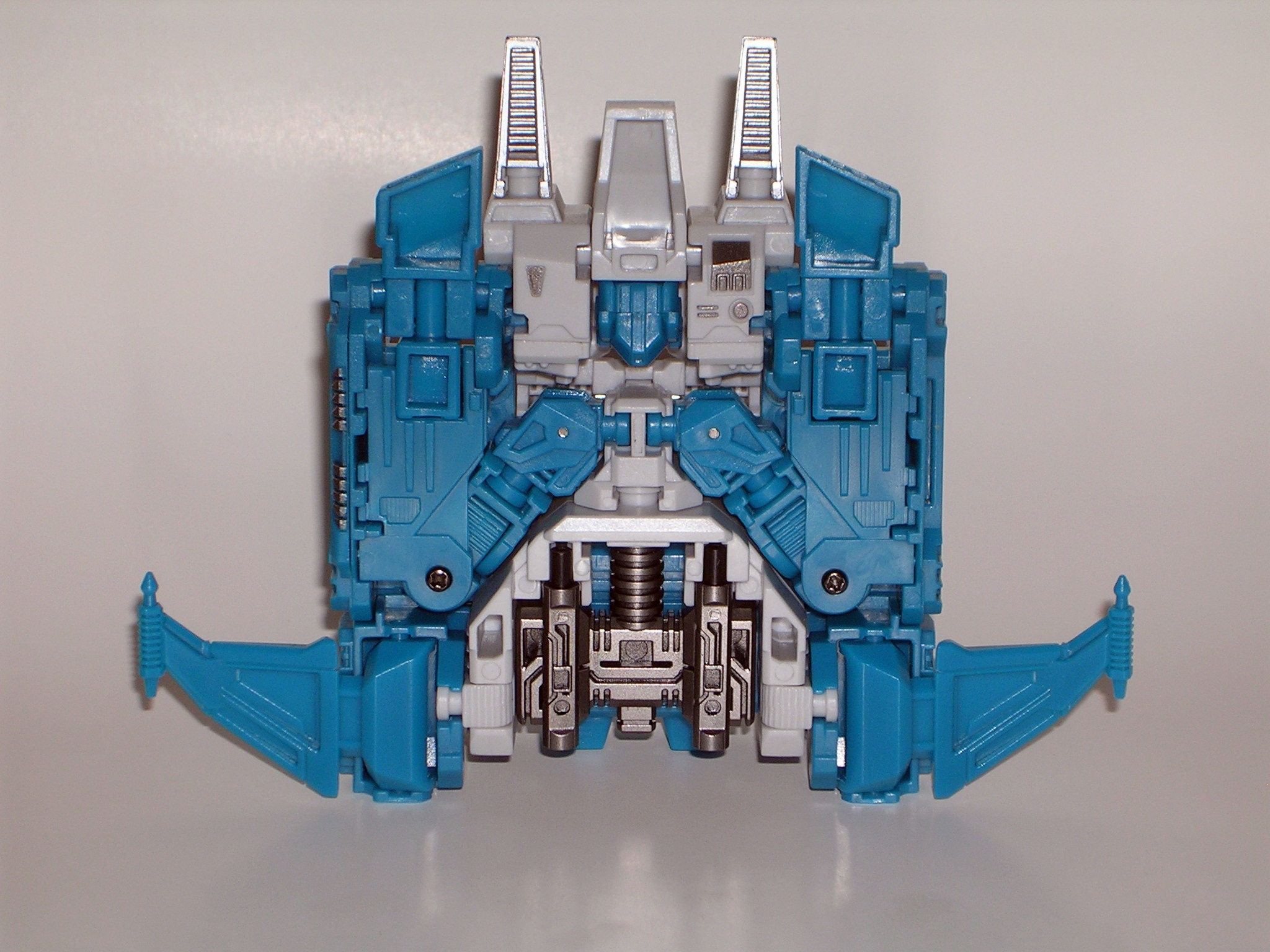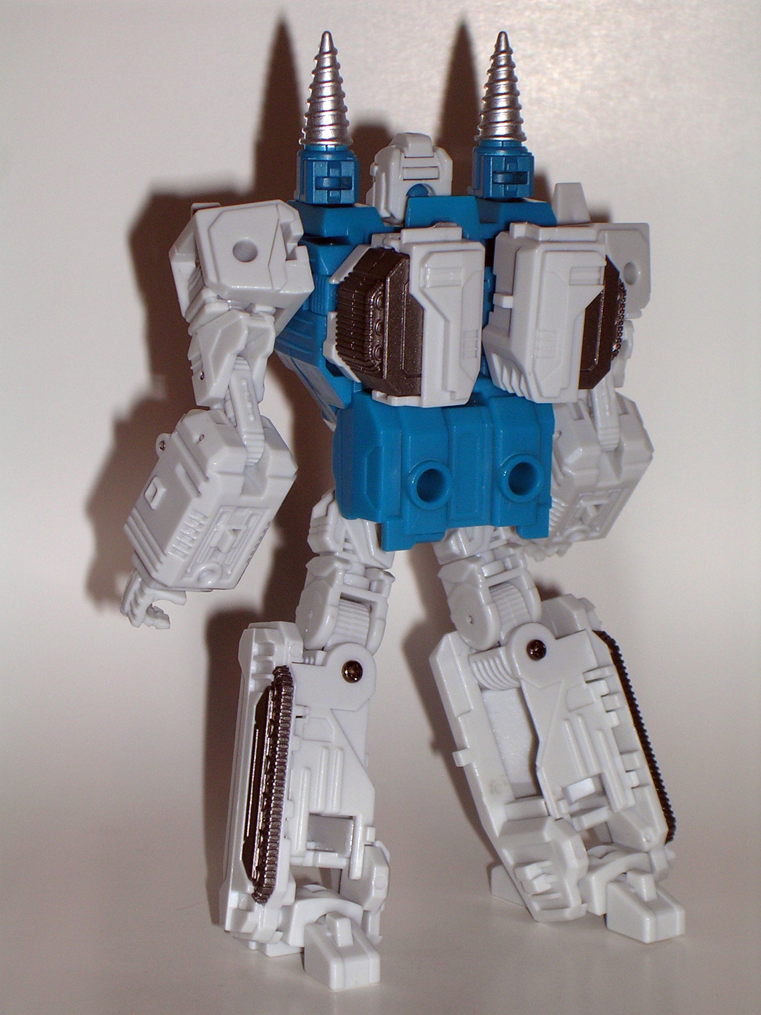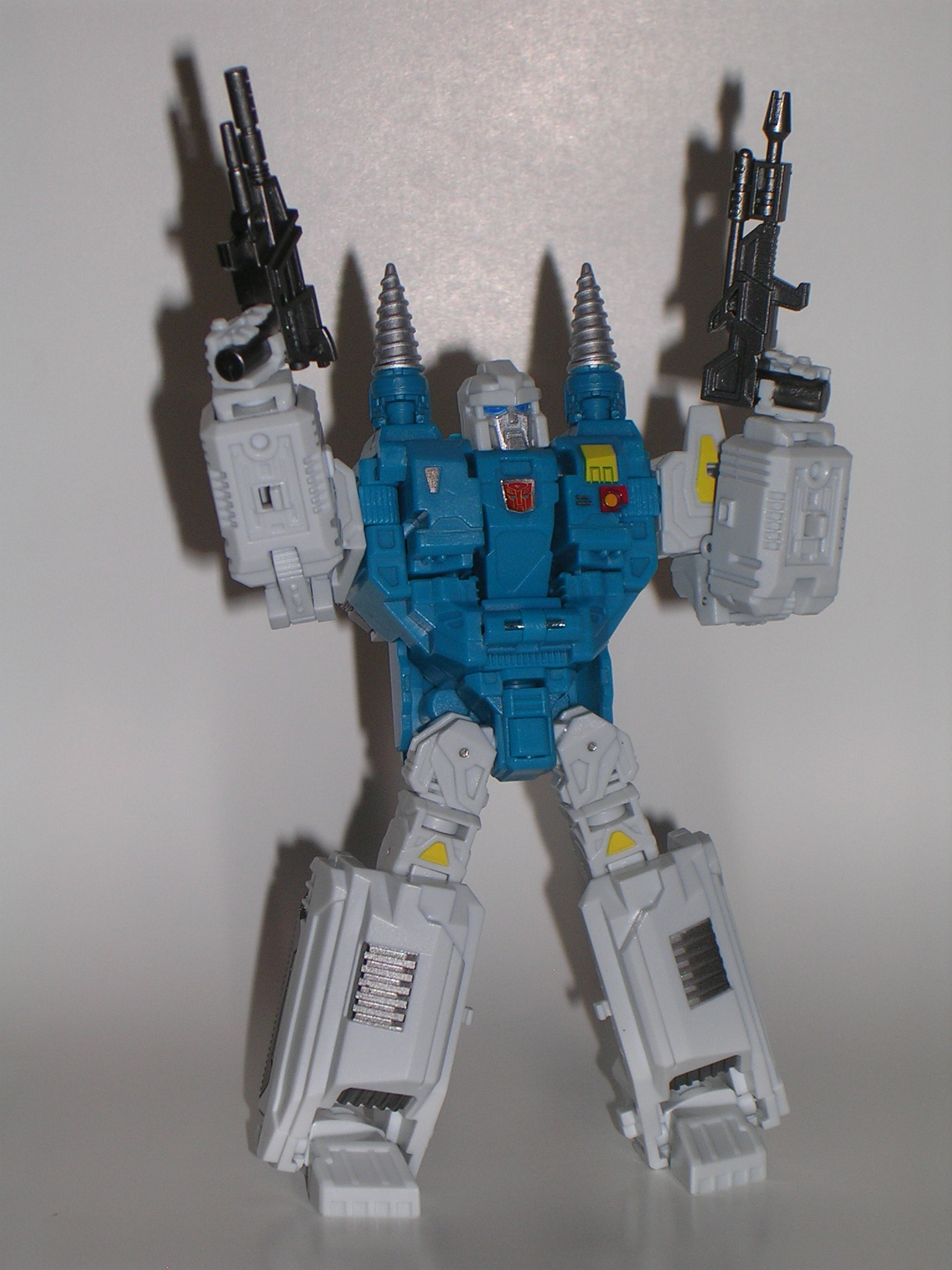 In robot mode, Grimlock features great articulation. His head is ball jointed; his arms rotate at the shoulders and have some lateral movement as well. The elbows are hinged and there are swivels in his biceps and wrists. He legs are ball jointed at the hips, his knees have solid ratchet joints, and there are swivels in his thighs. A waist swivel would have been nice, but what we got is pretty good.