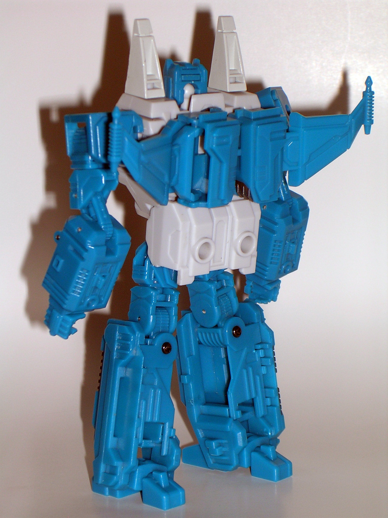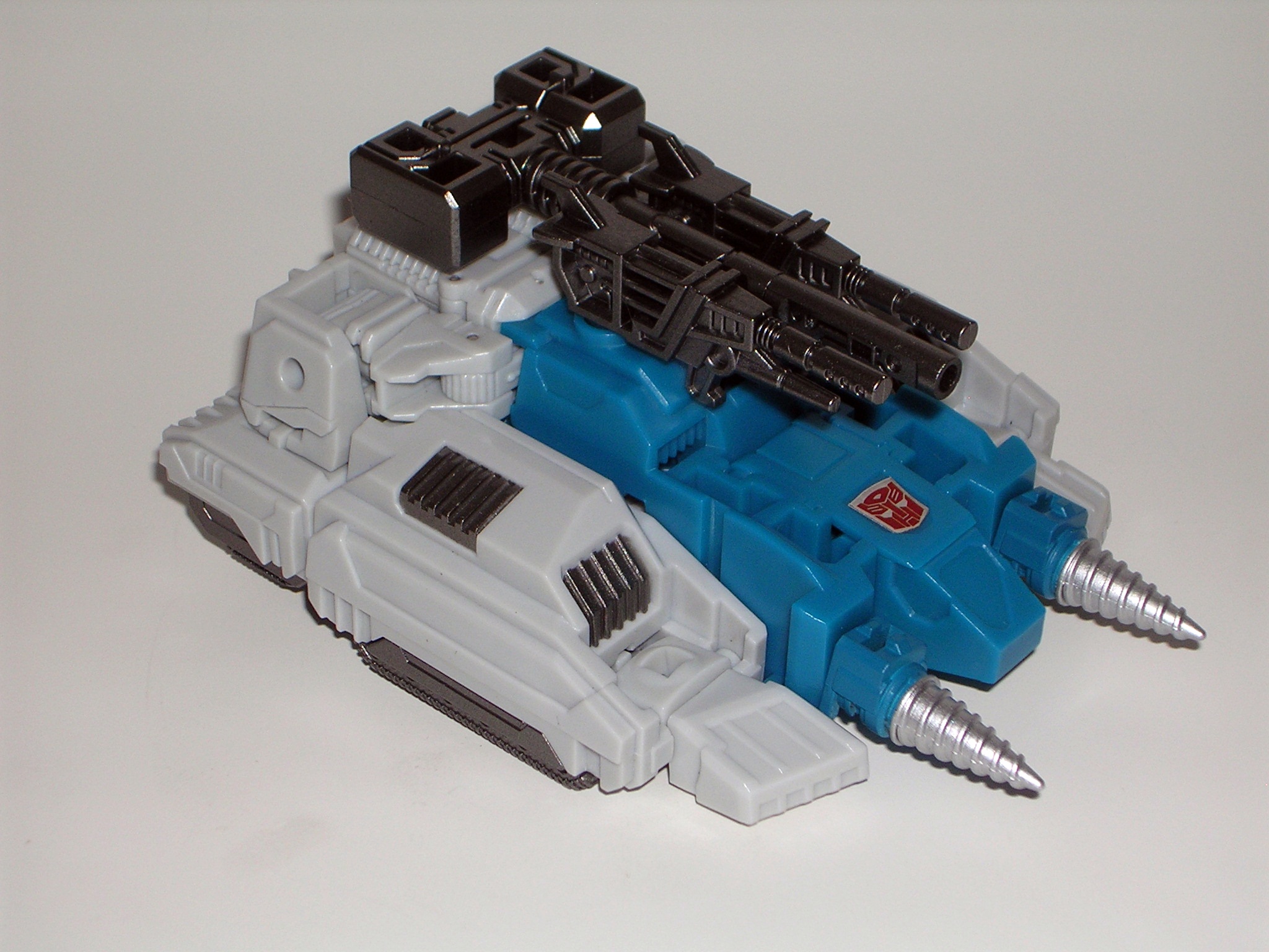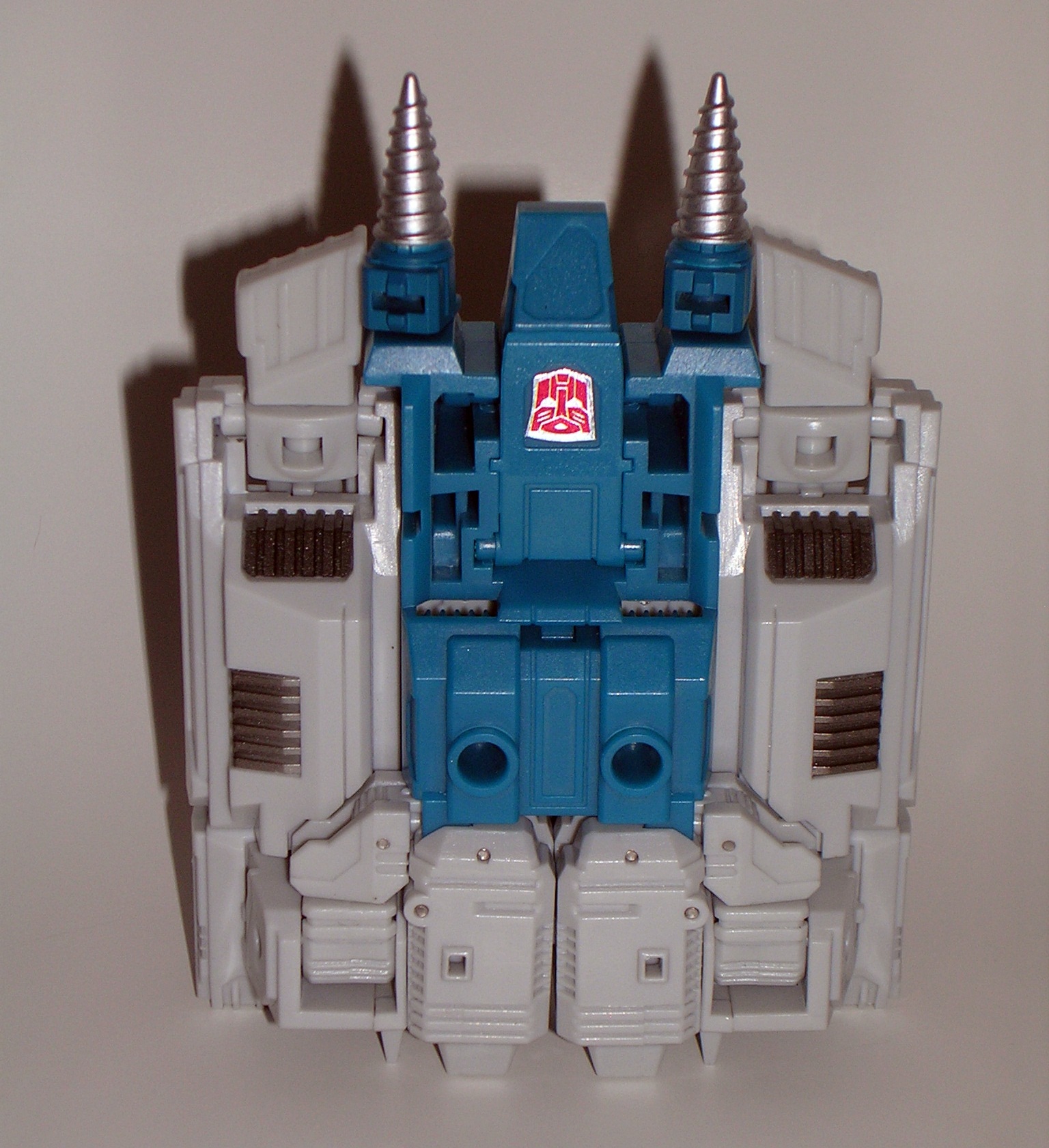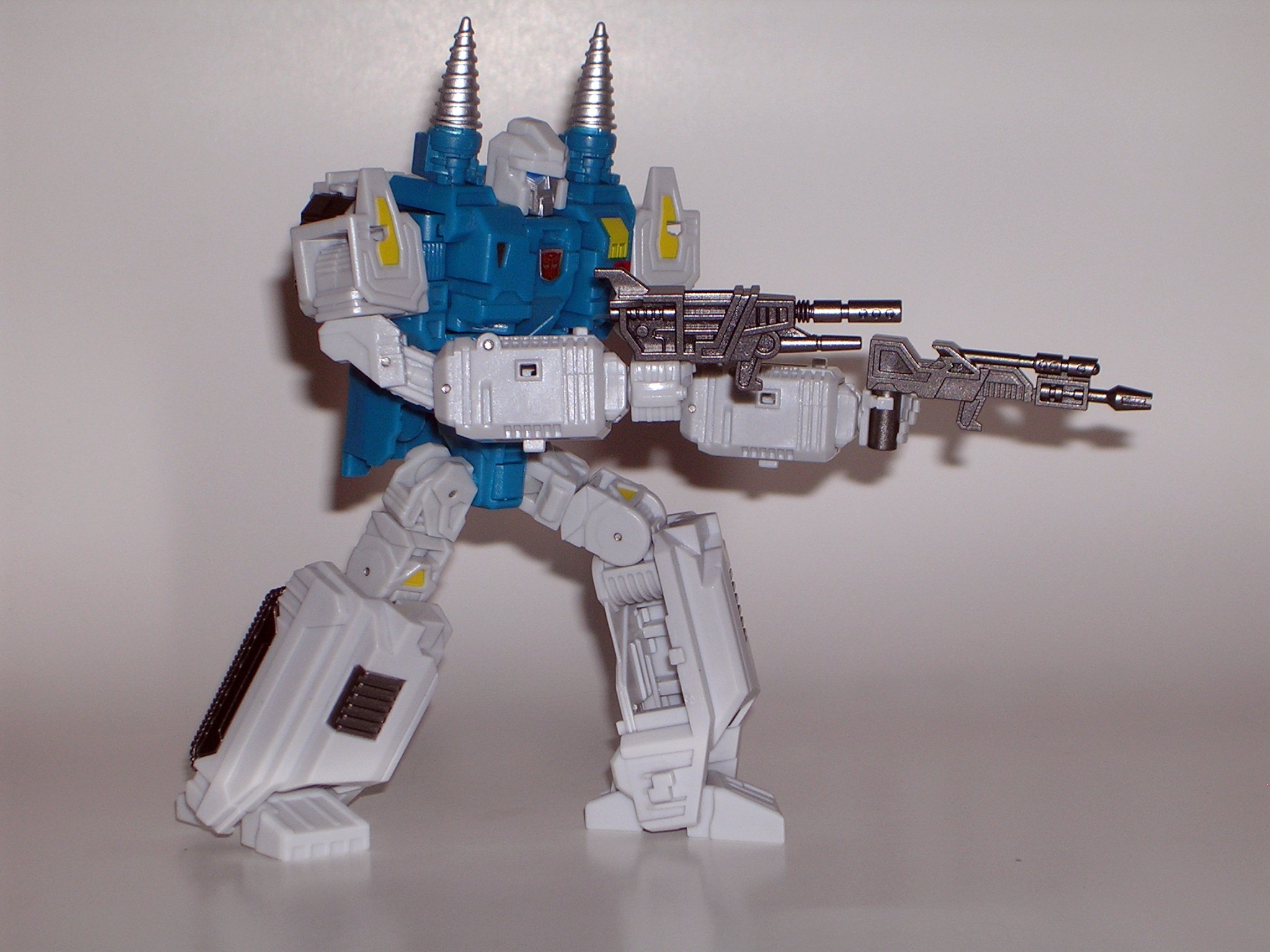 In robot mode, Grimlock features great articulation. His head is ball jointed; his arms rotate at the shoulders and have some lateral movement as well. The elbows are hinged and there are swivels in his biceps and wrists. He legs are ball jointed at the hips, his knees have solid ratchet joints, and there are swivels in his thighs. A waist swivel would have been nice, but what we got is pretty good.