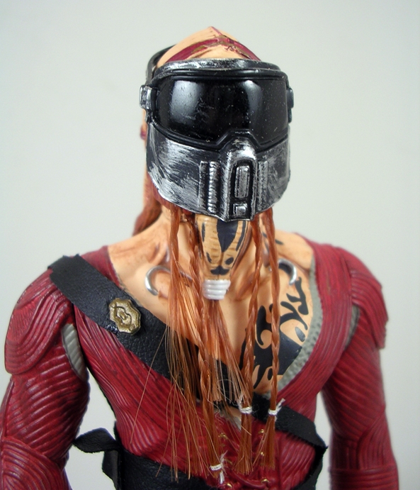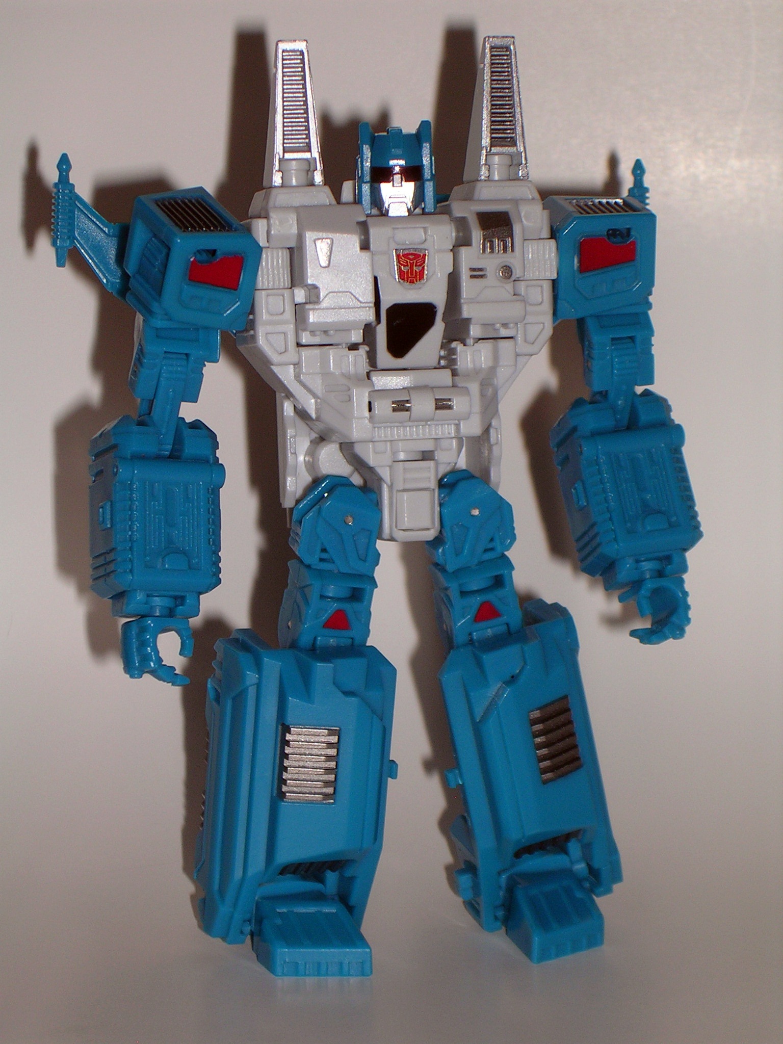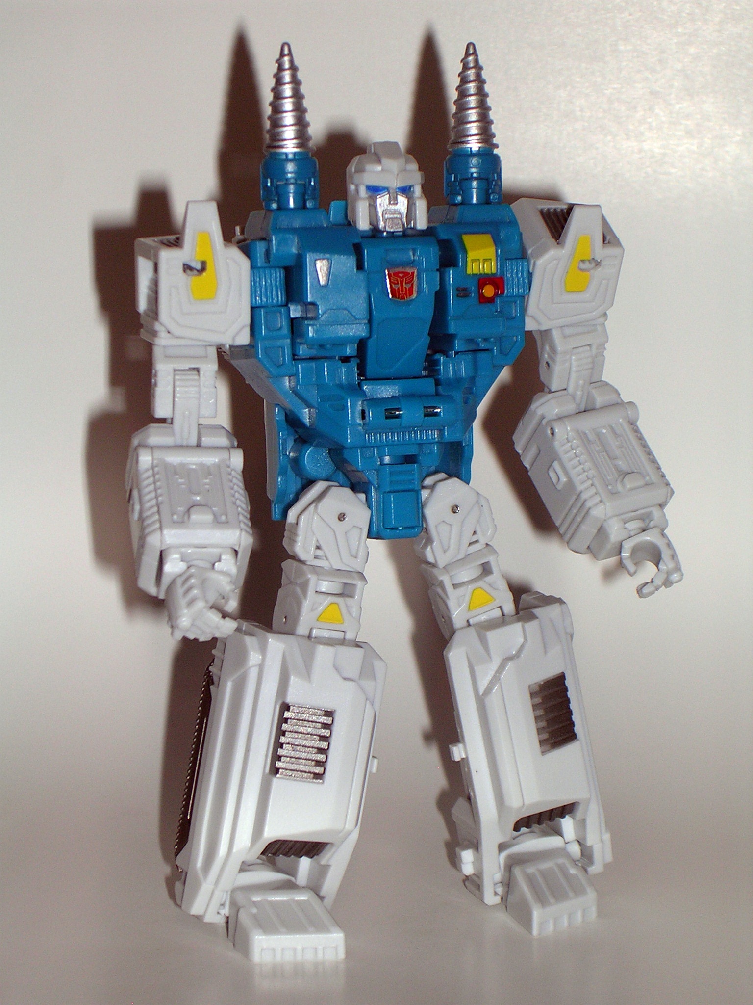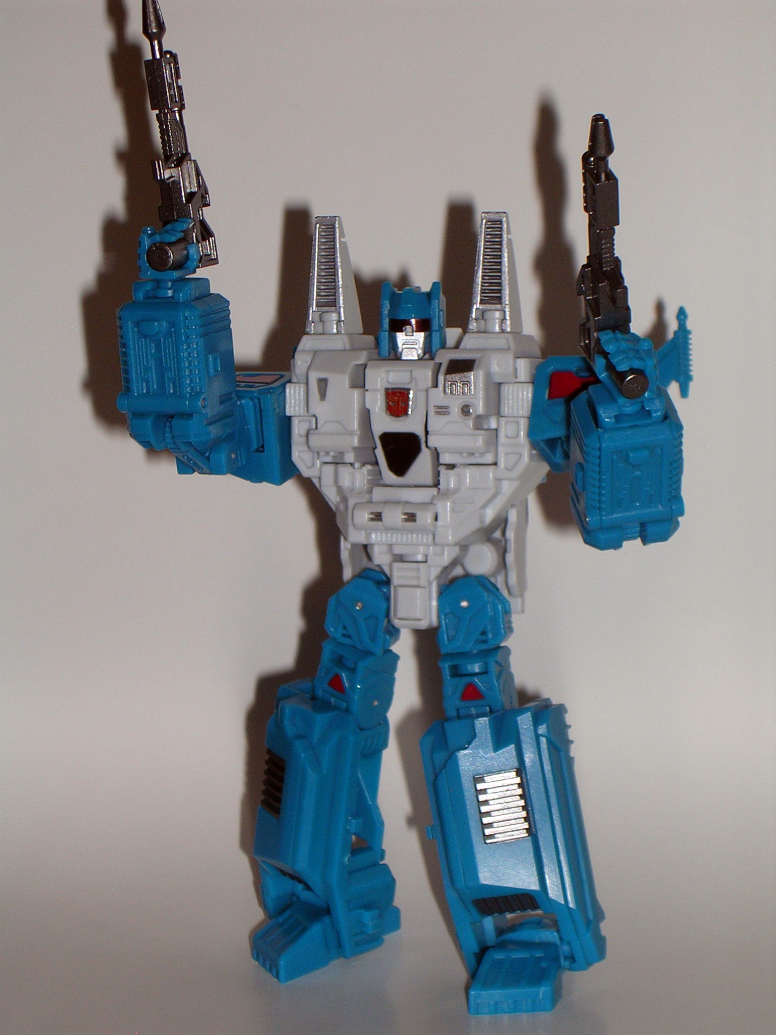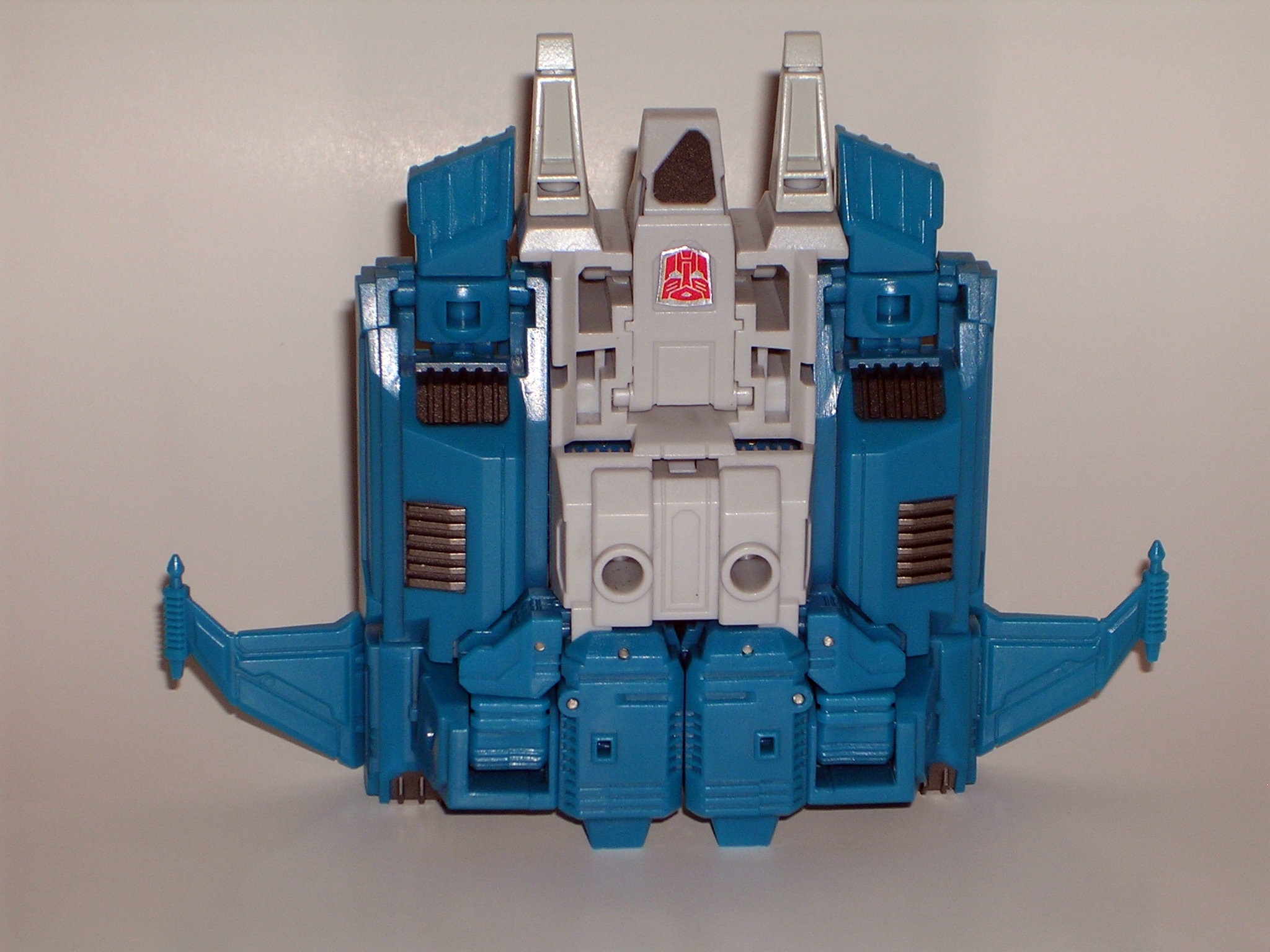 In robot mode, Grimlock features great articulation. His head is ball jointed; his arms rotate at the shoulders and have some lateral movement as well. The elbows are hinged and there are swivels in his biceps and wrists. He legs are ball jointed at the hips, his knees have solid ratchet joints, and there are swivels in his thighs. A waist swivel would have been nice, but what we got is pretty good.