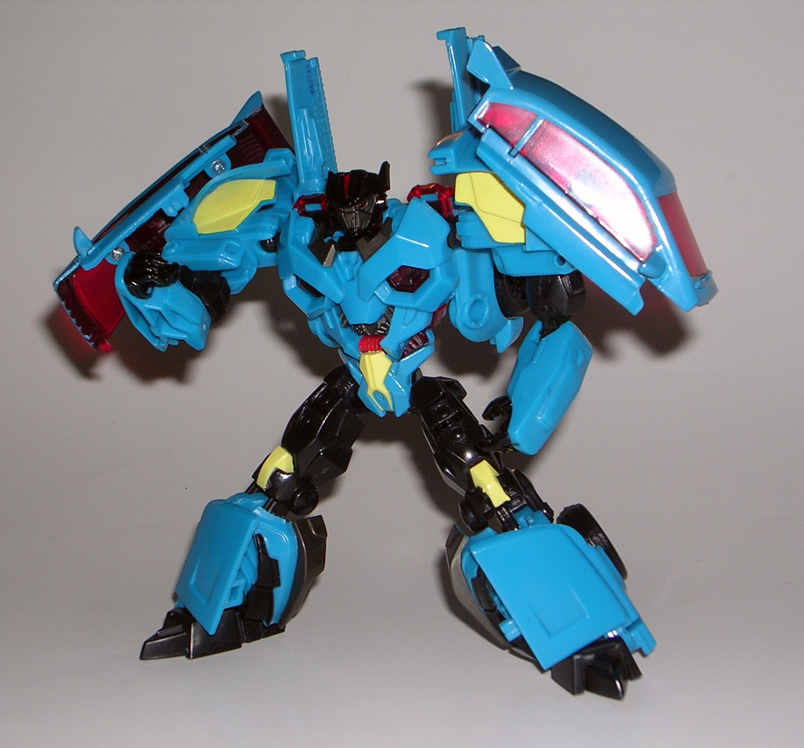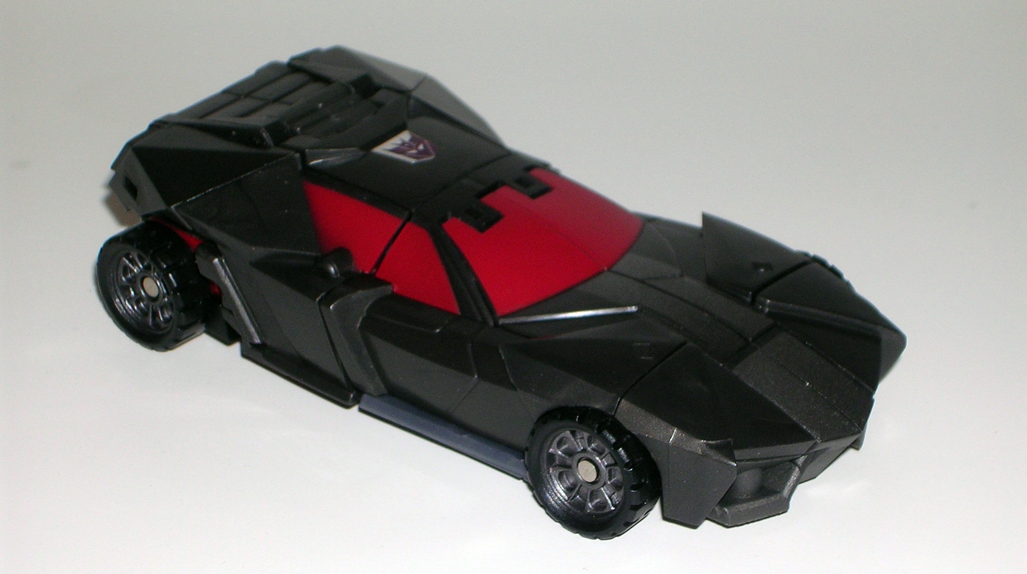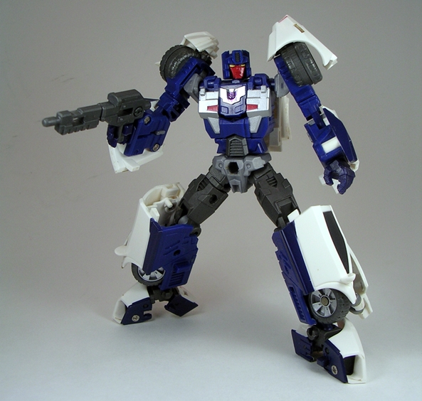The original G1 Wildrider was a Ferrari, while FP’s T-Bone is a Ferrari-ish concept car. The similarities to his G1 car mode aren’t as well-stated as Car Crash and Breakdown, but that’s ok because T-Bone’s alt mode is fantastic. Folks, this is what a Decepticon car should look like! He looks angry and dangerous! The angular plates manage to convey battle armor, and yet he still looks like a viable car design. Yes, T-Bone’s car parts are remolded from Car Crash, but it’s such a great and clever piece of work that, apart from maybe the rear engine area, succeeds in making the two cars look unique. The quality of the plastic is excellent, and everything locks together very well. The only issue I have here is that his weapon doesn’t store as exhaust pipes quite as well as Car Crash’s. One half pegs in fine, the other just doesn’t want to fit properly.