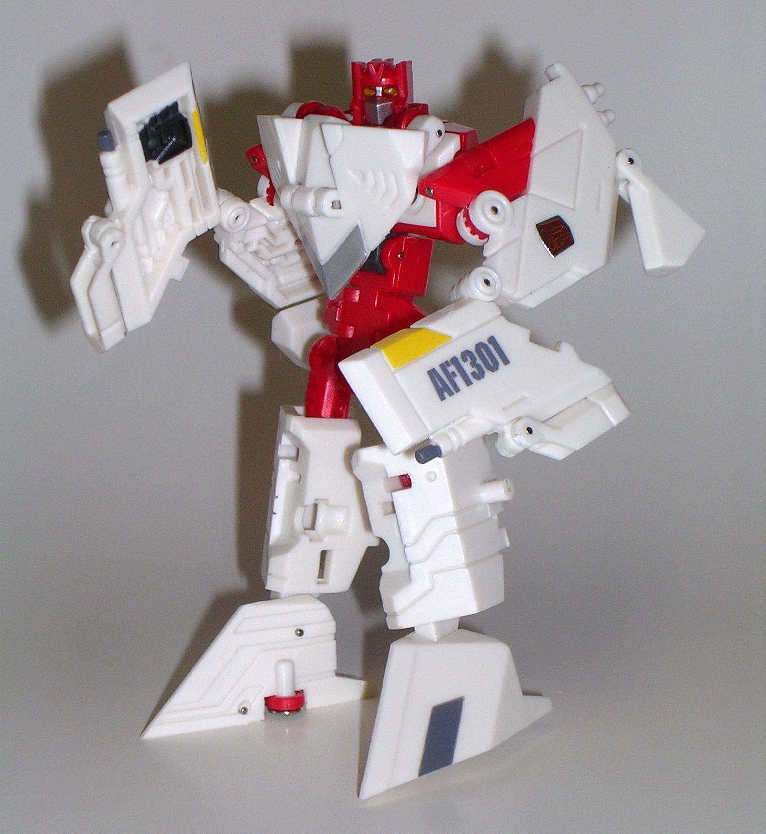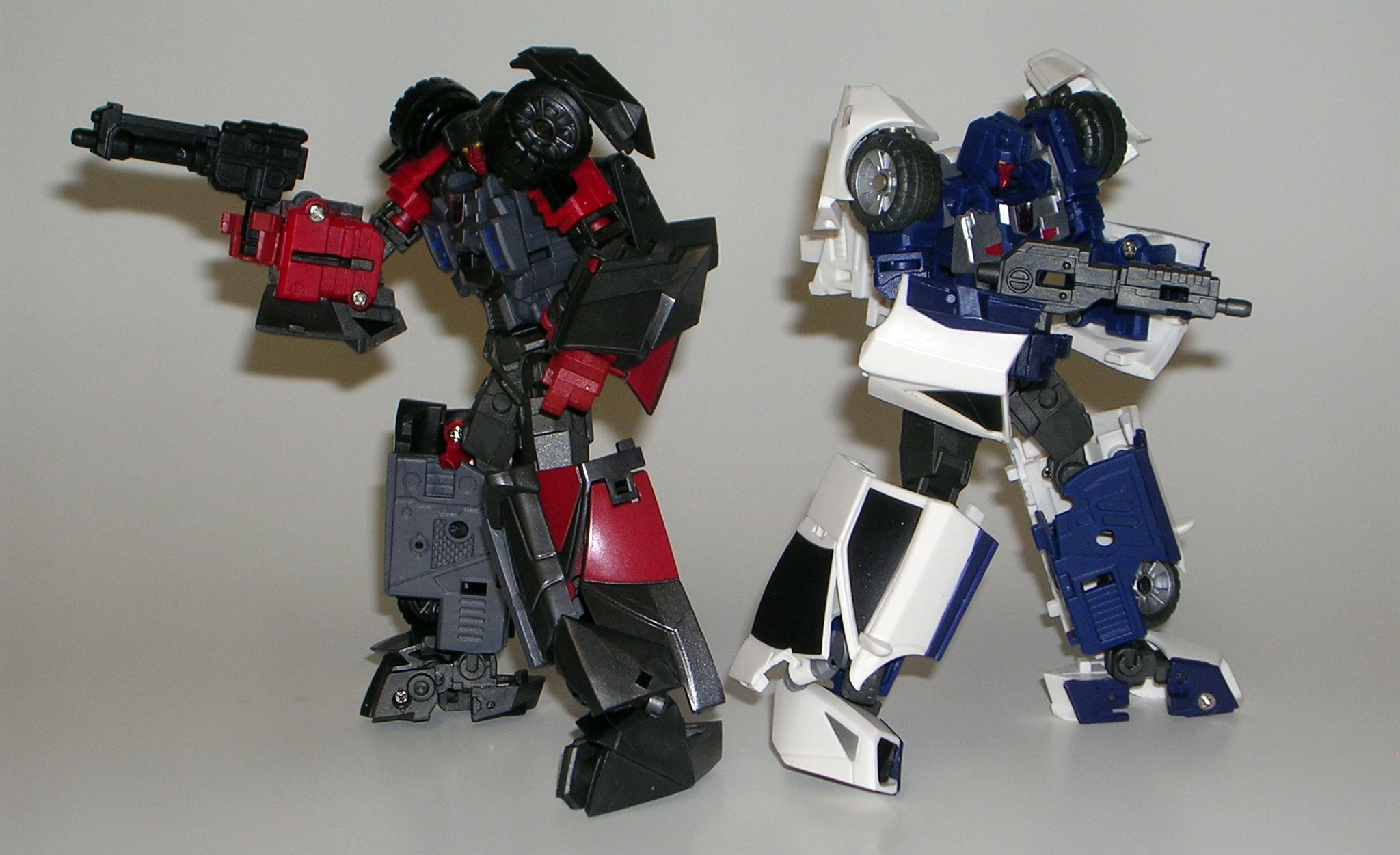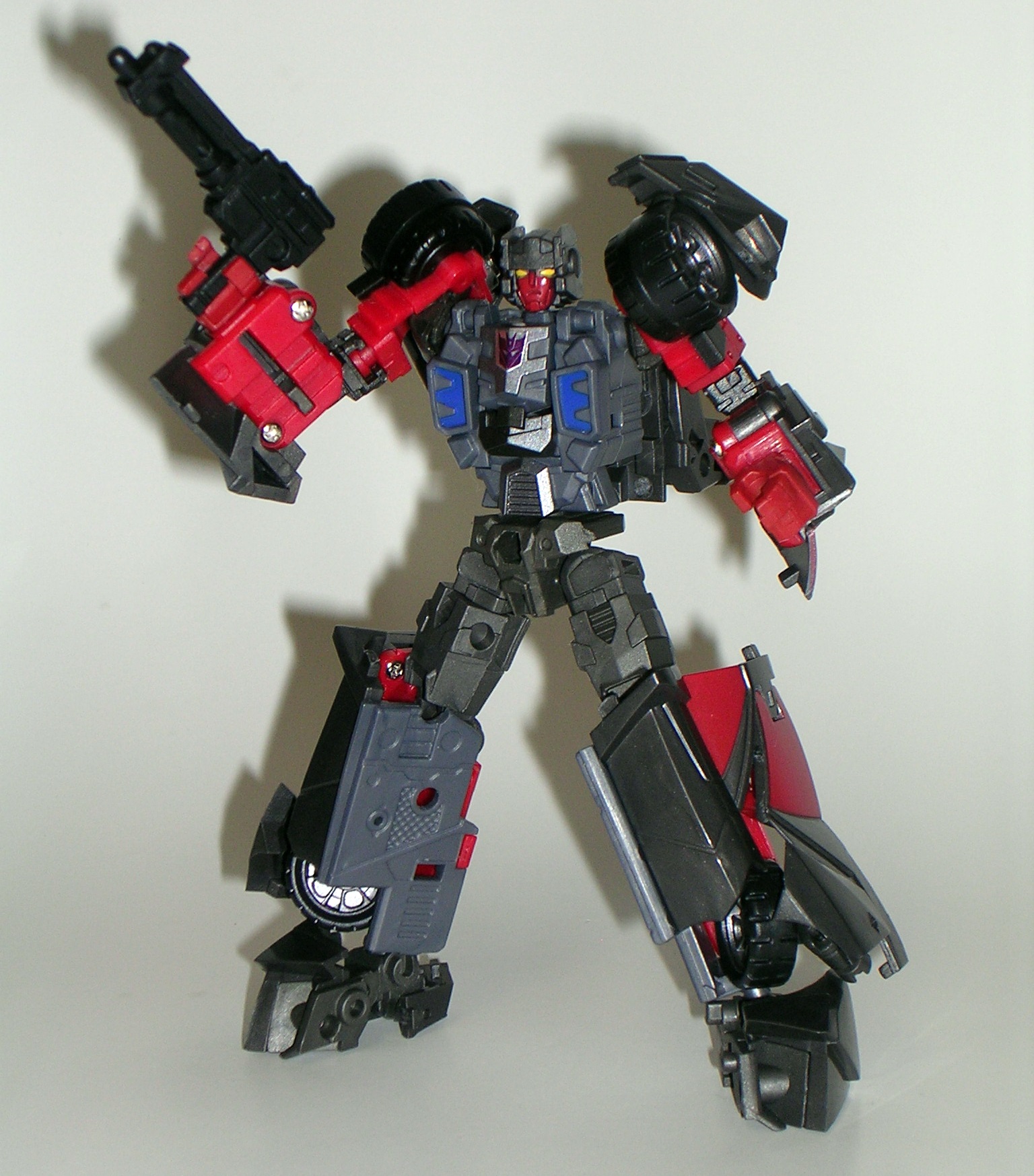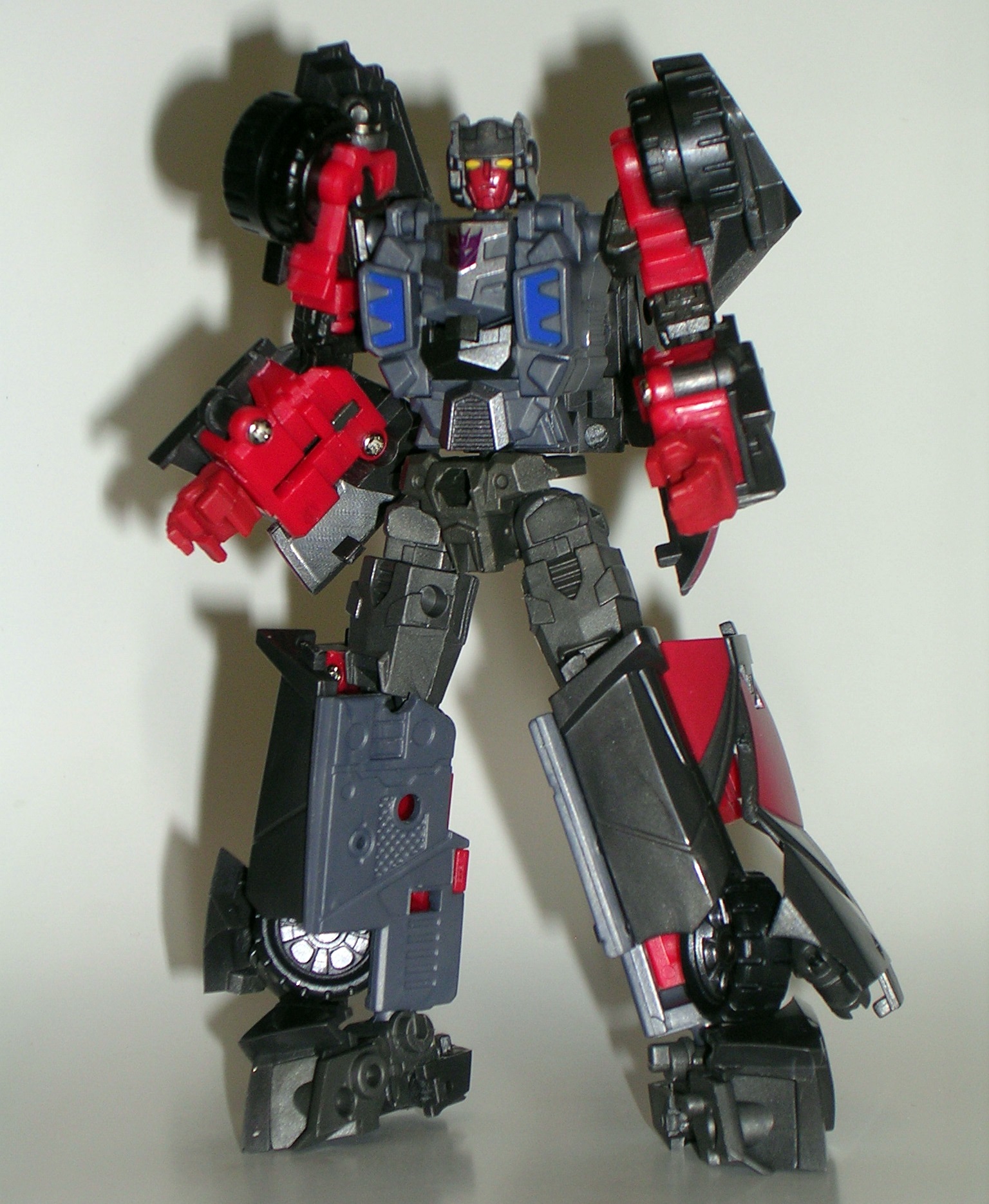 T-Bone carries over most of his alt mode’s deco into his robot form. He’s mostly grey and dark grey with some red on his arms. The color scheme is everything I could want in a Decepticon and he makes for a really nice contrast when standing next to Car Crash.