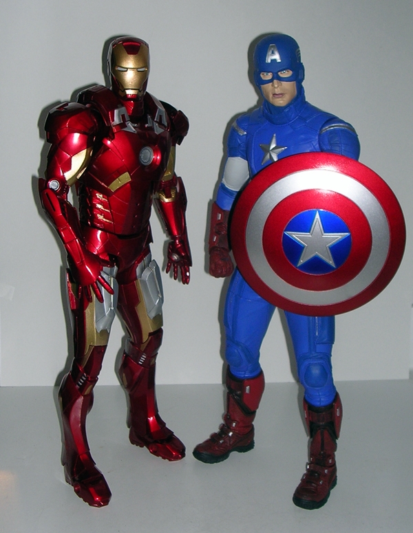 Ah, there’s a reason this armor is my favorite… it’s just gorgeous. I was a wee bit concerned that seeing it in this large scale might change my mind, but it’s only reinforced my love for the design. The mix of sweeping curves and angles scratches my itch right where it counts. The detail represented here doesn’t approach Hot Toys quality, but there’s plenty of fine touches to make it work. Some of the panel lines could have been cut a little deeper to be more convincing, but I’m only offering that up in an attempt to be critical of what is a quite marvelous sculpt. Iron Man stands at almost the exact same height as Cap. Some may point out that his legs are thinner, thus dispelling the illusion of a guy in a suit of armor. I can see that, but at this point, just about every Iron Man figure I’ve seen falls into this trap and I’m at the point where such things don’t bother me anymore.