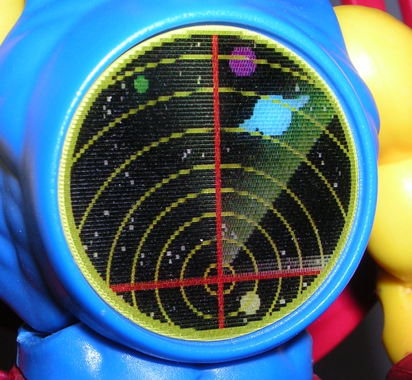 But it’s not just the beautiful colors that make Sy-Klone unique. He also sports a nice mix of new sculpting and a reuse of some less obvious parts from other figures. Let’s face it, anyone in Eternia who doesn’t wear a furry diaper is a trend-setter and with his ringed gauntlets and boots, backpack, and stylish arm fins, Sy-Klone really gives off a cool futuristic vibe. The radar screen in his chest is a lenticular sticker, which causes the screen to move as you view it from different angles and I really dig how pixelated the graphic looks. Matty did a nice job recreating the one on the vintage toy very closely.