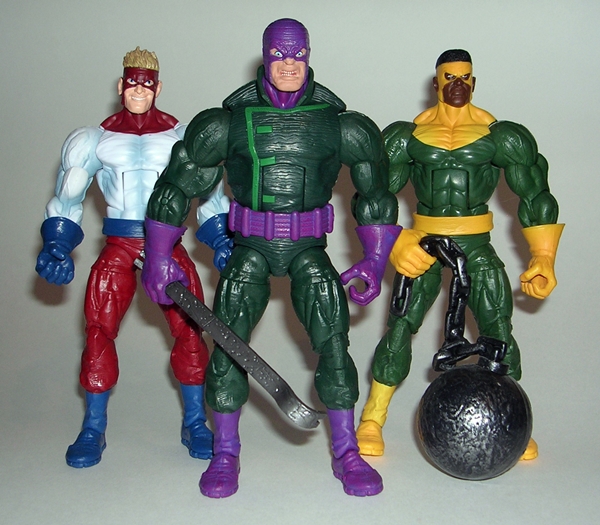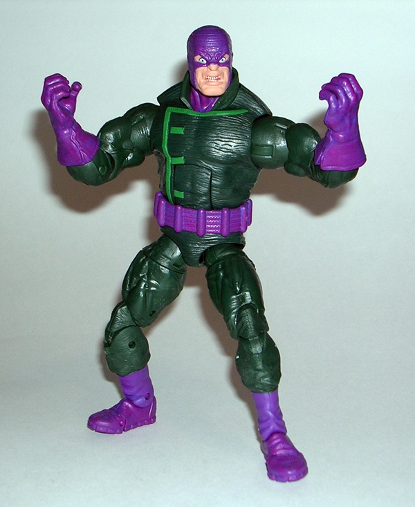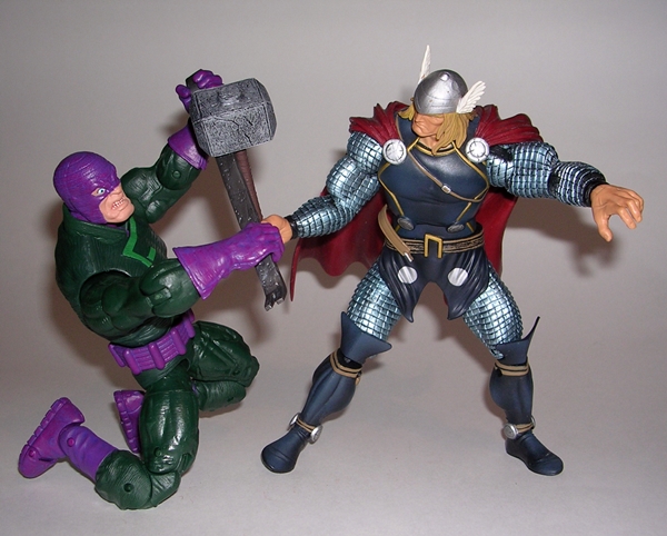 Wrecker is a big beast of a figure, but he has to be in order to stand tall with his chums, Piledriver and Thunderball, let alone go toe to toe with Marvel Legends’ Heroic Age Thor. He represents a sensible reuse of parts with the same arms and legs as his cohorts in crime. The torso is a newly sculpted piece, featuring nice texturing and his tunic with the button down front flap and high collar. The belt is also new. His deco is comprised mostly of dark green plastic with purple gloves, boots, belt, and mask.