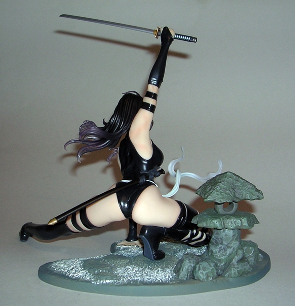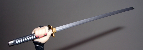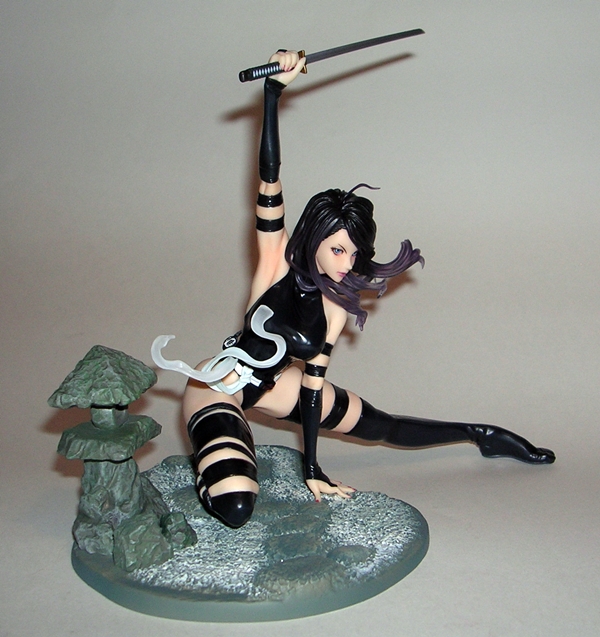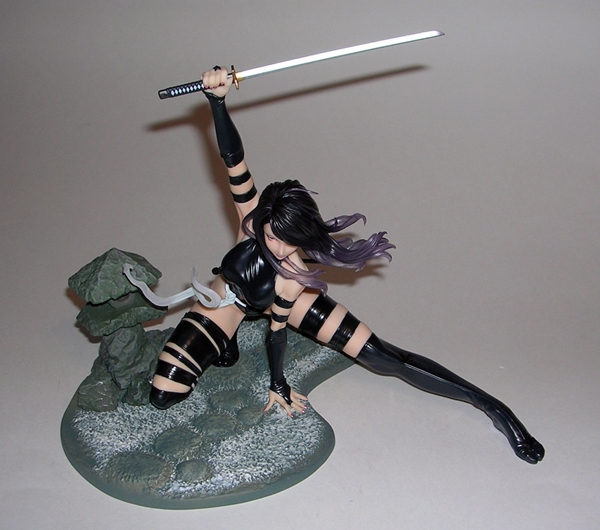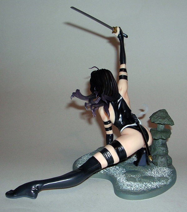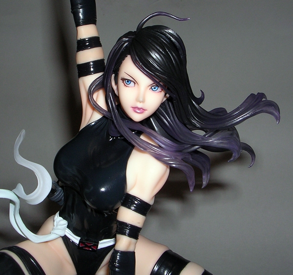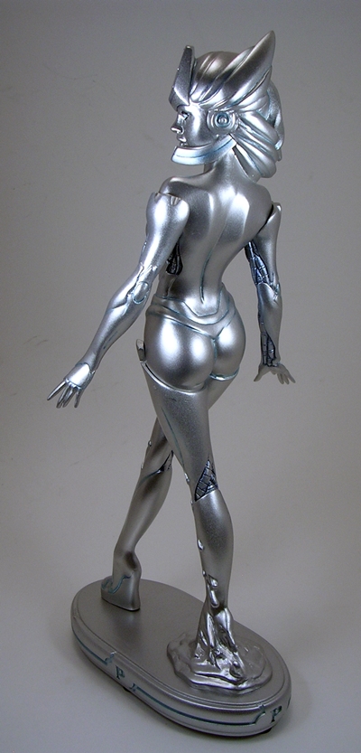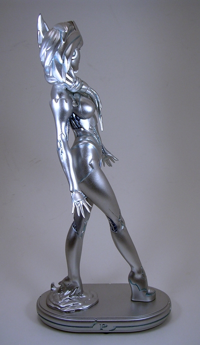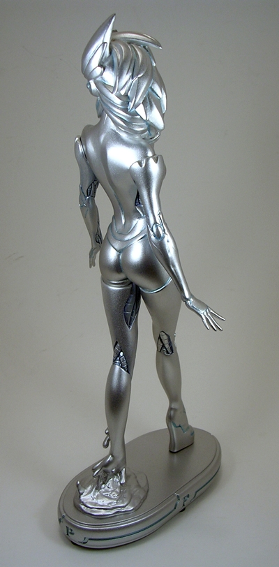 When dealing with statues, I usually like to kick things off with the composition or sculpt, but in this case the first thing you may notice is the rather monochrome nature of this statue. The entire piece is painted in a metallic silver (or dare I say, platinum?) color with some black scant panel lining to bring out the details of the sculpt. That’s not a complaint, mind you, as the coloring is quite nicely achieved, looks good on the statue, and is above all appropriate. It is, however, worth noting because if you’re looking for a colorful piece for your shelf, this isn’t it. On the other hand, here’s a piece where you don’t have to worry about paint slop or bleeding and the metallic effect is quite striking, particularly when seen in person.