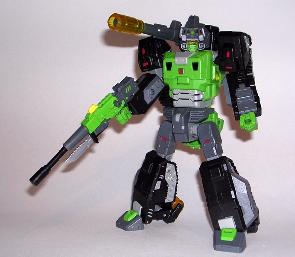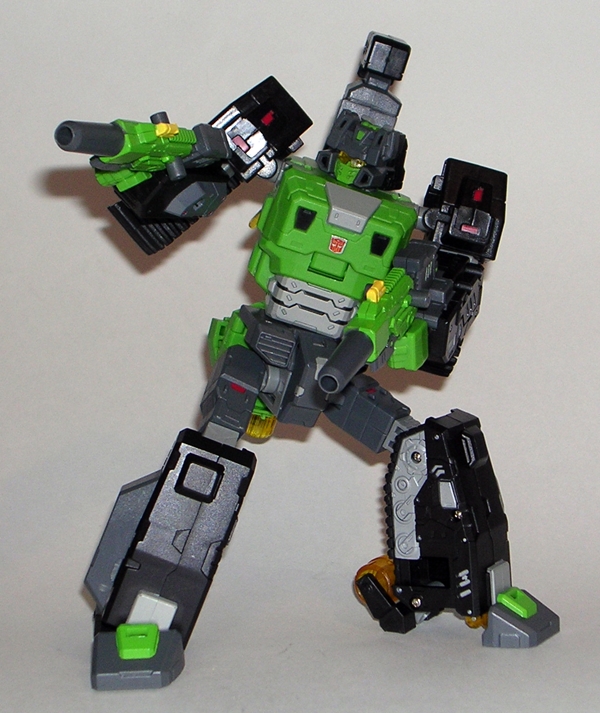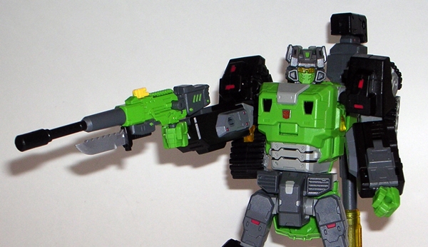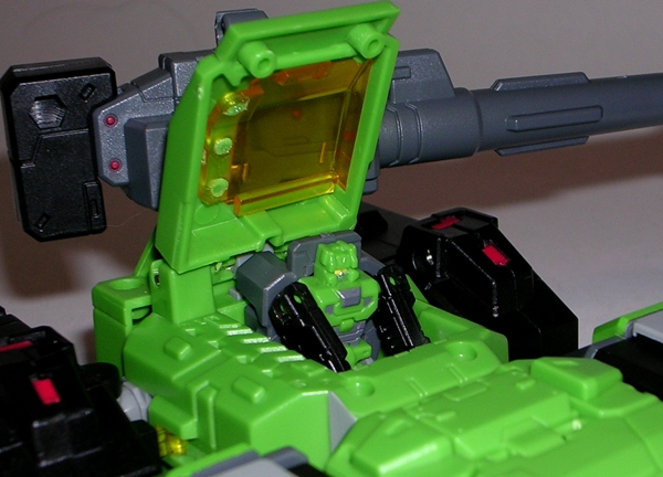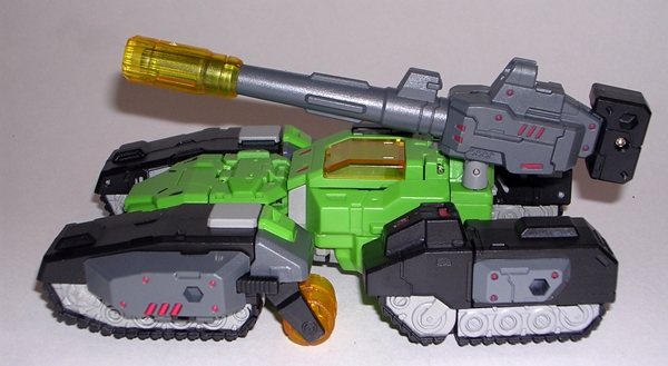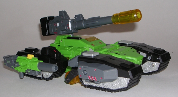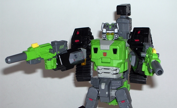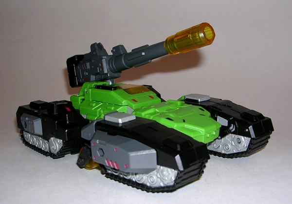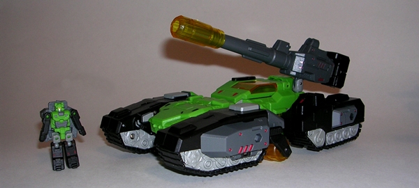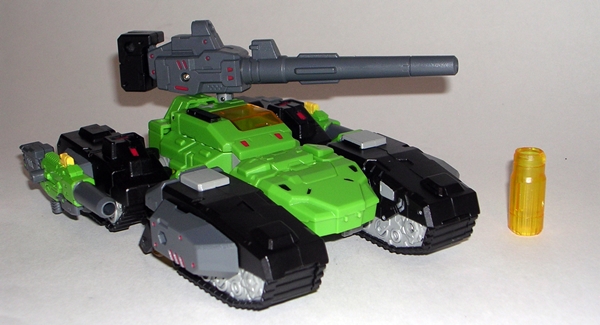 The heft on this guy is pretty nice and the quality of the plastic feels great. I’m also really happy with the shade of green that was finally used. Early promotional shots made him out to be bright neon green whereas the final product ended up a lot closer to the green used on the Hardhead that I remember. There aren’t a ton of paint apps, and I’m Ok with that. The mold itself includes enough sculpted detail to carry the day and there are enough different color plastics used to make him look exciting. I particularly like the hatch sculpted onto the back of the tank and there’s some effective detailing in the faked-out treads.