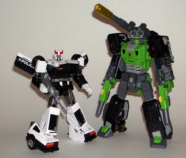 Well guess what? It is! I found Hardbone’s transformation to be fairly straightforward. There are a few double-hinged panels that were a little tricky until I figured out what they were doing. While probably not necessary, I stripped him of his weapons, including the gun barrel and bayonet that are concealed in his tread panels. Unpacking his legs took a bit more force than I would have liked and unfolding his hands proved to be a challenge. Eventually I got them flipped out by inserting the handle of the bayonet into the socket and using it as a tool. But when all is said and done, this guy is absolutely gorgeous. He’s just the right amount of boxy to scratch my G1 itch and the head, while a little too difficult to turn, just looks fantastic. Hardbone is considerably larger than Fansproject’s Function figures, but I think he scales beautifully with them. He’s a tank so he should be bigger and chunkier and I find that the aesthetic matches perfectly. He even scales rather well with the Masterpiece Datsuns.