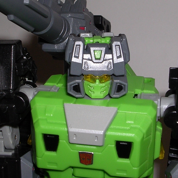 Like his spiritual successor, Hardbone is a Cybertronian tank and a pretty cool looking one at that. The body is molded in green plastic with four sets of chunky black treads positioned all around him. He has removable guns mounted on the sides of his rear treads (which can also be pegged into the front treads) and one big mama of a cannon, which connects behind the cockpit and can be offset to the left or right side. The smaller guns can also be pegged into the cannon to create one giant Decepticon-busting mega-cannon. The cannon can swivel left or right as well as raise and lower and there’s a translucent yellow muzzle at the end that can be removed if you don’t fancy it. Beneath the sculpted treads, Hardbone rolls along on six translucent yellow wheels.