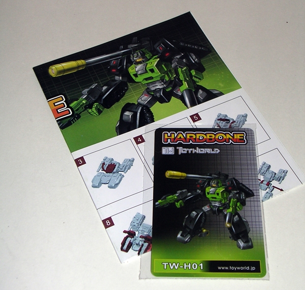 Naturally, the box is collector friendly. You just open the side panel and slide out the cardboard tray, which in turn holds the plastic tray that contains the goods. Hardbone is secured to his tray by three wire twisties and his cannon rests below him. The head-robot sits in his own compartment toward the top. Also inside you get a folded color instruction sheet and a profile card that doesn’t really tell you anything. Let’s check out Hardbone’s alt mode first!