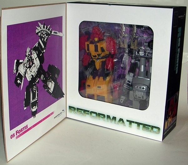 Fortis comes in a large box with a front flap that opens to reveal a window, which in turn shows off the figure in his robot mode. It’s the same deco as we saw used for the last release only with new character art. I seem to recall being a little underwhelmed with the deco the first time around, and I haven’t really warmed up to it any. There’s nothing specifically wrong with it, quite the contrary, it’s a nice collector friendly box, and the flap that protects the window is appreciated. I guess, I’m just not feeling it from an artistic standpoint. I’d rate the presentation here higher than Toyworld’s , but not in league with TFC’s Uranos or most of what Fansproject has done. But in the end it all comes down to personal taste, so your mileage may vary.