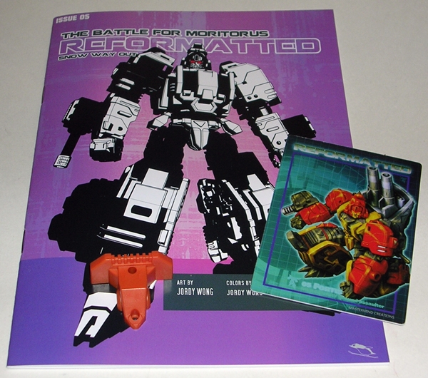 Inside the box you get an illustrated cardboard tray that holds a clear plastic tray. Fortis has all his gear laid out beside him, including the massive foot and hand combiner part, which doubles as his BFG in rhino mode or backpack in robot mode. You also see the first piece of evidence here pointing to what a great company MMC is and how they listen to and care about their customers. There were some isolated instances of paint rubbing on Bovis while he was in the package, so Fortis comes with an extra piece of plastic taped over the tray to keep him from rubbing on the front tray. Classy!