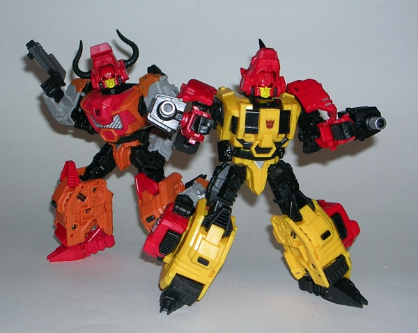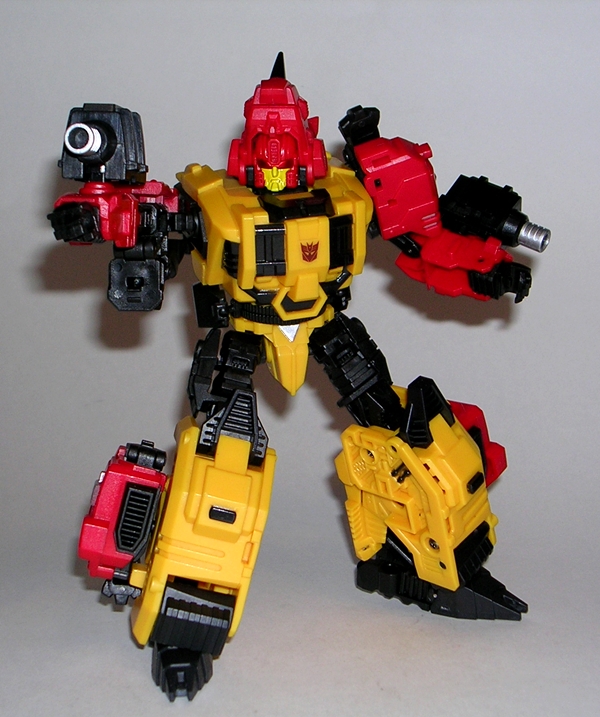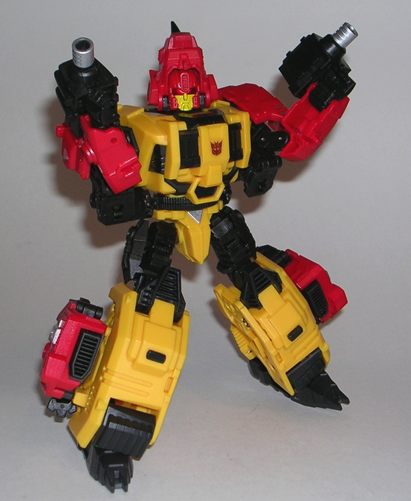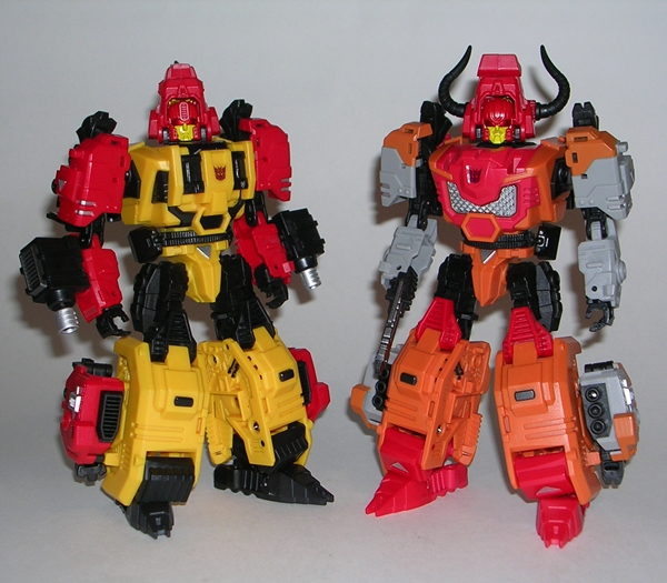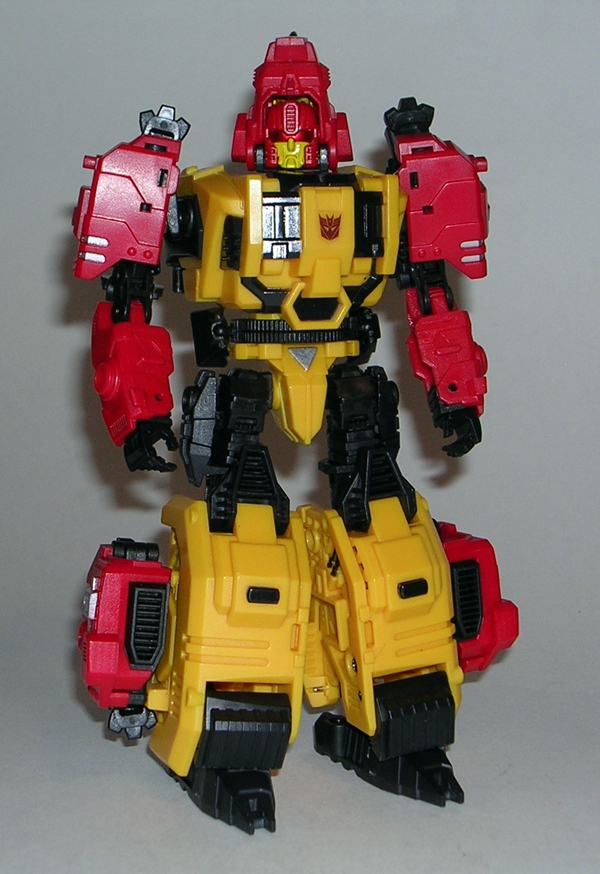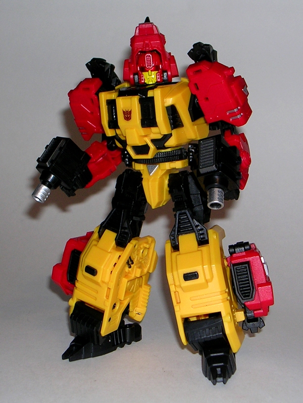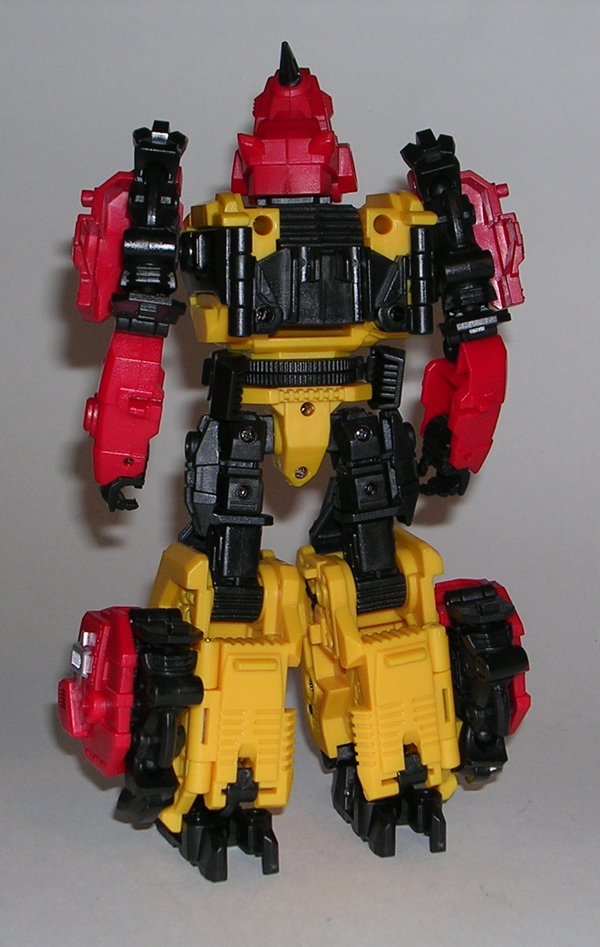 The coloring on this guy is right in line with the original G1 Headstrong toy and that means that it’s a lot more obnoxious than the red and orange of Bovis. It uses the same beautiful red plastic as Bovis, only this time it’s paired with bright yellow and black. Initially I wasn’t sure the colors would transfer so well onto the toy, but I believe the finished product’s yellow is a tad duller than initial promo pictures, which I think really help it along. Again, the bulk of the toy’s coloring comes from the actual plastic, which is always a good thing to me, although there is some silver paint detailing here and there to help make the figure pop a little more.