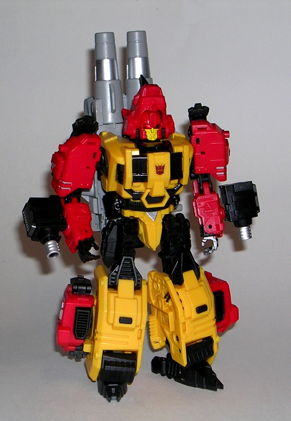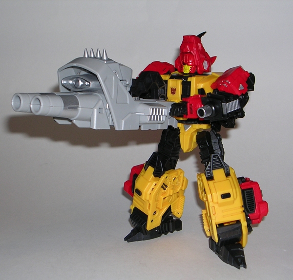 Naturally, Fortis can also equip the combiner parts as a backpack in his robot mode. It looks pretty good on the figure and adds a great deal more bulk. He’s designed so that he can still stand reasonably well with the huge cannon on his back. He can also wield it in both hands as a weapon of mass destruction. I really dig the fact that even though these combiner parts are freaking huge, they’ve still been worked into the figure. Like Bovis, Fortis can be displayed either holding or wearing every last piece that he comes with and that’s very cool.