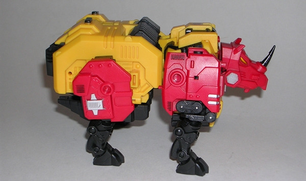 Fortis transforms exactly the same as Bovis, so if you’ve had that figure around the block a couple of times you should be good to go here. I haven’t transformed him since October, so it took me a little fumbling about to get it right. In theory, the transformation is pretty basic. The legs fold out from the back of the rhino and the arms fold out from the front legs. In practice, there’s a lot of extra tucking and folding to deliver on the kind of engineering that you would expect in a $100 toy. The result gives you all that extra articulation and makes certain that all those rhino bits peg in perfectly when you’re in robot mode.