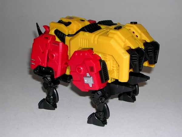As both Fortis and Bovis are going to form Feral Rex’s legs, it’s only natural that they would share much of the same body and engineering. Nowhere is this more obvious than in their animal modes. There are plenty of remolded parts on Fortis, but the limbs and back section of the animals are nearly identical with only the remolded front section, new head, and the rather drastic new color scheme to set them apart. I’m totally cool with that as it’s expected with combiners and the mostly shared body works fine for the rhino and bull alt forms. Fortis’ head is smaller than Bovis’ but it still sports that great angular cyber-animal sculpt. The single horn is painted black and I really dig the silver grill pieces on his cheek plates. As with Bovis, Fortis’ jaw can open and close, but if you look underneath you’ll see his robot face peeking back out at you.