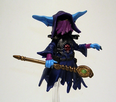 I really do love the character design here. Since most of my exposure to Trollans comes from the annoying and blundering Orko, it’s very cool to see a menacing and evil member of the race. The very idea of a spell slinging Trollan Warlord intrigues me. Gorpo comes clad in tattered dark blue robes with some nasty looking trappings sculpted in. The detail on his belt consists of pouches and a dagger, he’s got chest and shoulder armor and a sculpted red skull in the center of his chest. The stock portrait includes a purple hood with a drooping point, long blue ears, and two sinister yellow eyes that peer out above his purple mask. I used to doodle guys like this back in my AD&D obsessed days. In fact, Gorpo would look right at home on the cover of a TSR module, hovering around some lair full of dusty books and summoning an unholy beast from a stone well. I just dig everything about this guy!