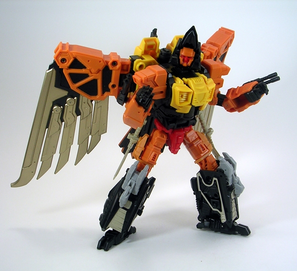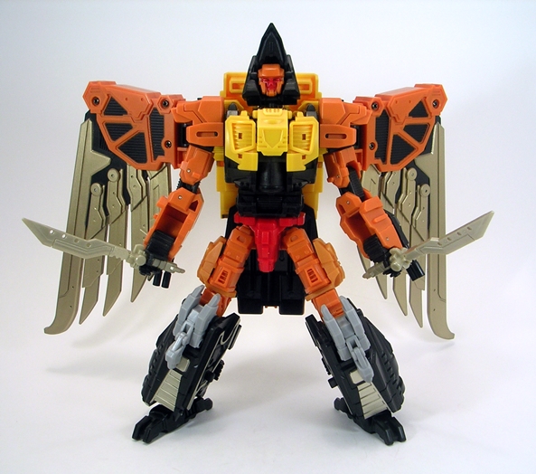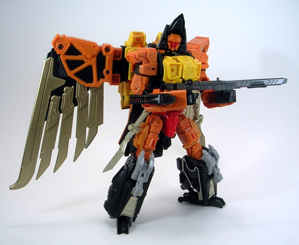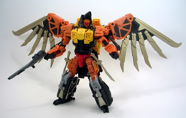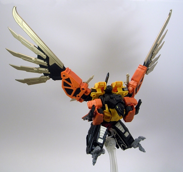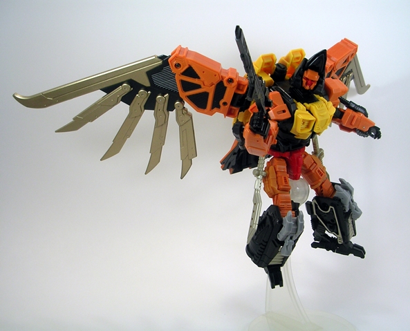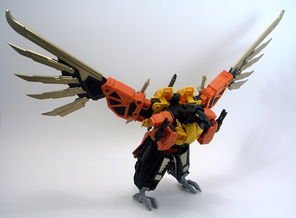 One is that even with Talon’s robot head folding into the bird head, there’s still articulation in the beak. Secondly, just like in robot mode all of Talon’s weapons store comfortably on his bird mode. The arm cannons can stay right where they are, the swords can mount on his wings, and his rifle can peg right into his back, giving him that extra little bit of firepower. He can even stand just fine on his own, which frankly surprised me.