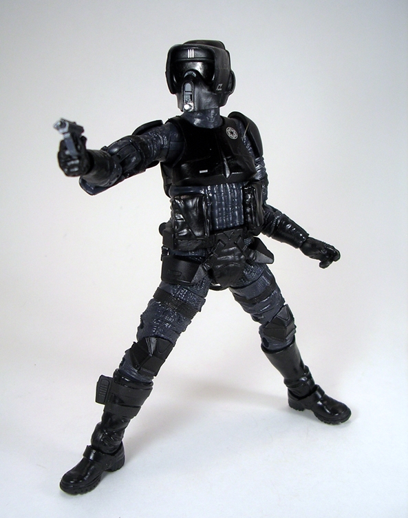 Let’s start with the Shadow Scout and Speeder Bike. I just looked at the original versions of these things last week and so I’ll try to be brief. It’s obviously the same figure with a new coat of paint and the new deco consists of black armor with dark gray used for the bodysuit and the abdominal area. You also get some gray and silver paint hits to pick out the details in the sculpt and an Imperial insignia neatly printed on the left of his chest armor. The black alternates between a straight matte finish and some areas with bit more gloss. I really dig how the ankle holster and straps are painted to stand out from the boots. I’m really impressed with the way the deco on this guy came out.