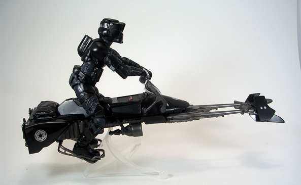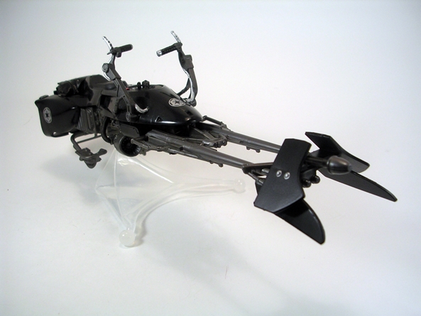 The handlebars are a bit warped on mine, but if I display it with the Shadow Scout riding it, it’s impossible to tell. It also comes with the same tringular stand. Yes, the stand still feels all soft and cheap as hell, but damn if it doesn’t work great and add some options to the display.