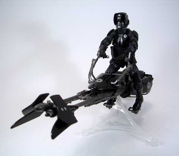If the Shadow Scout impressed me, the new deco on the Speeder Bike absolutely wowed the hell out of me. I mean… damn. The paint finish on this thing is absolutely fantastic. Once again you get a couple different styles of black, both matte and glossy and the combination makes this piece really shine. Toss in some gray plastic and some silver paint hits and you’ve got a piece that pops like crazy. The Bike also comes decked out with Imperial insignia stamped on each side of the back and a smaller one dead center between the handlebars. If Hot Black Desiato, the lead singer of Disaster Area, owned a Speeder Bike, you could be damn sure this would be it! And yes, I like to think that Hitchhikers exists in the same universe as Star Wars.
