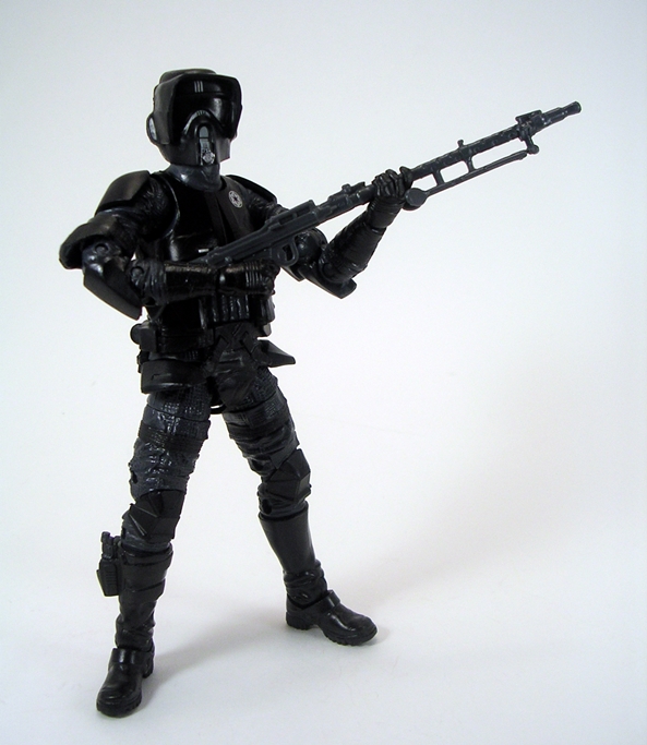 The Shadow Stormy comes with his E-11 Blaster and you also get the rifle that came with the original Sandtrooper and the one that came with the original Stormy. The E-11 comes in the Shadow Stormy’s hand, but the rifles are mounted between the figures in a community pot, so I guess they’re up for grabs. I seem to remember in the Battlefront games the Biker Scouts were also snipers, so I’ll likely give him one of the rifles.