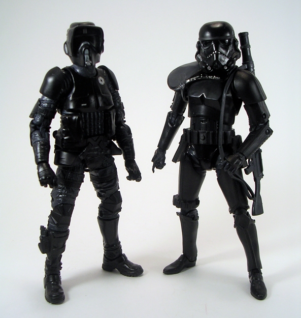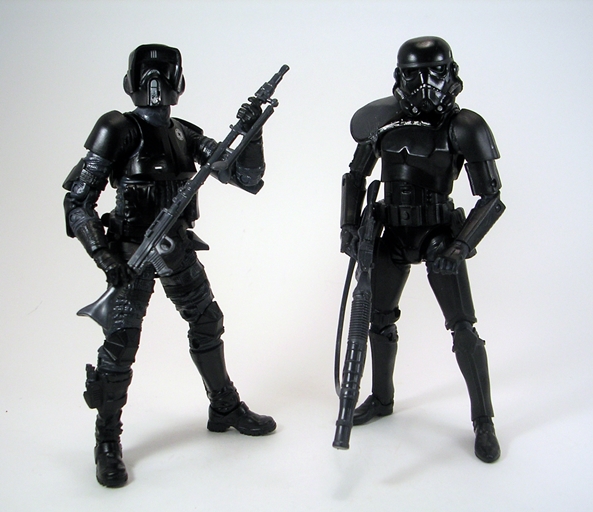 It may be a special exclusive, but the box is still mostly black and featureless. It’s pretty similar to what we got with the Speeder Bike set only elongated to include the extra figure and weapons. The back drop is illustrated with a still from A New Hope where the Falcon was sitting in The Death Star’s hanger bay. Yup, these Shadow Troops are so damn stealthy we couldn’t even see them in the movie. Why did they have a Speeder Bike sitting on the deck there? Because… shut up! Anyway, the box is still collector friendly and I may just save this package to keep the figures in there because I’m not sure how well they will fit into my regular 6-inch Black display.