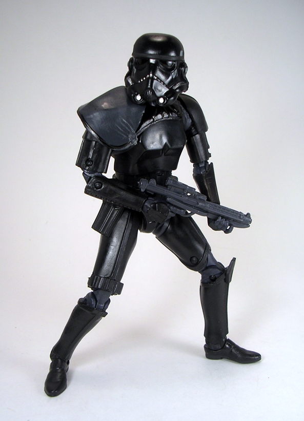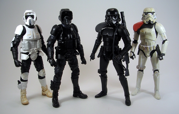 Lastly, you get the Shadow Stormtrooper Commander looking equally dapper in his black and dark gray deco. This is actually a repaint of the Sandtrooper, rather than the straight Stormtrooper (yes, there are differences in those two sculpts) and he also comes with the pauldron. Once again the deco here just looks phenomenal. The deco still consists of a mix of matte black and slightly glossier black with the bodysuit in dark gray and some grey and silver paint hints to pick out the details in the helmet.. The pauldron looks exceptionally sharp with a matte black surface surrounded by a glossy border. I guess my only complaint here is that he didn’t get an Imperial insignia stamp. I think one would have looked good on his chest armor and that way my OCD wouldn’t be acting up over the fact that the Scout has one and the Stormy doesn’t.