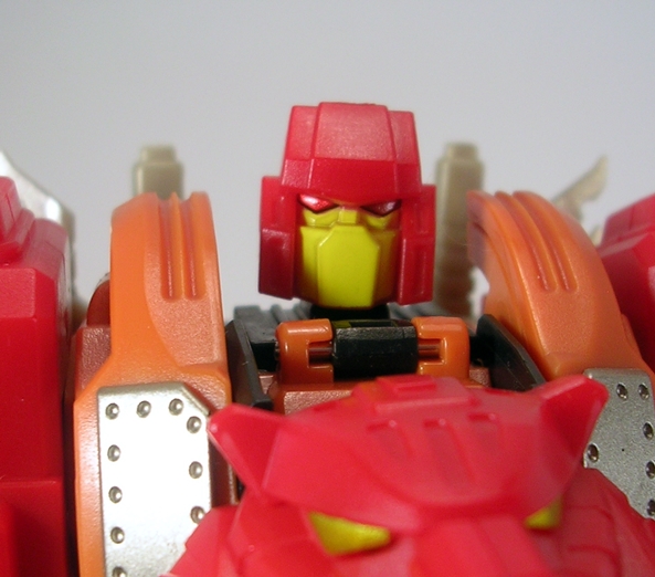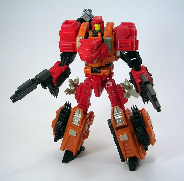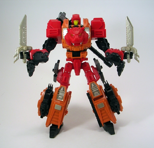If all that isn’t enough, Tigris also comes with an extra baggie of parts that fill in the hollow forearms of the entire team and allows you to peg in some additional weapons and stuff. Additionally, the bag contains a replacement face with a red painted mouth plate. I’m sticking with the stock yellow one just because it adds some much needed diversity to the Tigris’ color palette. Ok, so enough about the robot mode and all the goodies, let’s get him transformed and check out his beast mode…