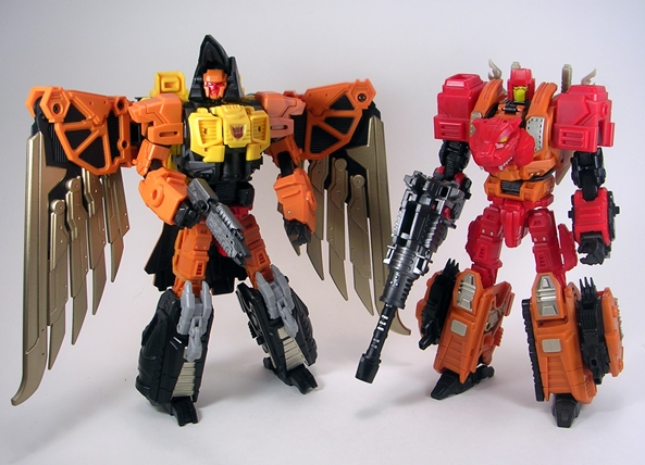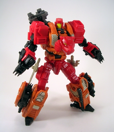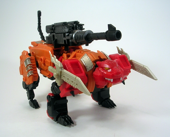 While a lot slighter in build than Bovis and Fortis, Tigris’ beast mode follows the same basic patterns of transformation with the robot arms becoming the front legs and the robot legs packing up to form the back half of the animal. The deco remains mostly the same as in robot mode with a lot of orange and red plastic and a little black plastic and silver paint apps showing. Tigris’ jaws are articulated and you get the same great poseability out of the legs as we’ve seen all throughout this line. It’s not a bad tiger mode, but I don’t think the proportions work as well. Maybe it’s because his head is sort of tiny, but mostly I just think the bull and rhino translate better to chunky robots than a lithe tiger.