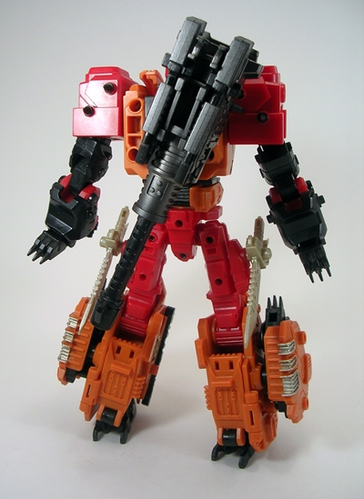 Tigris’ deco consists mostly of red, orange, and black plastic. I’m sure I’ve said before how much I love the quality of plastic that MMC used on these guys and how well it holds the colors. That having been said, Tigris’ deco is the least interesting to me. The other figures seemed to have that one extra color to help break up the pattern. For Bovis it was grey, for Fortis it was yellow, etc. He’s still a striking and colorful looking bot, but I think the deco could have used something more. There are at least some very nice silver paint apps on his chest plates, his knees, and some of the rivets.