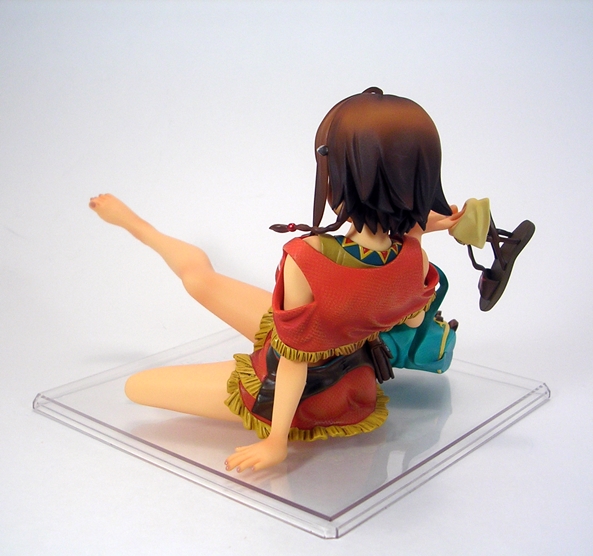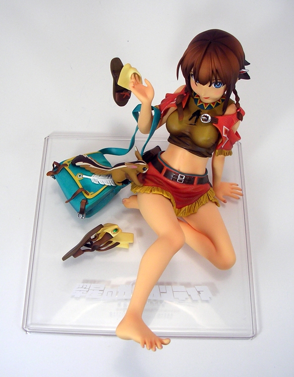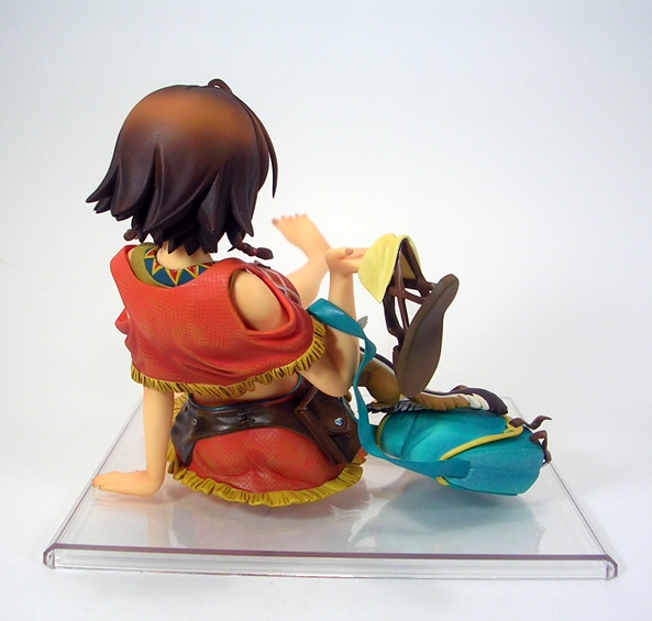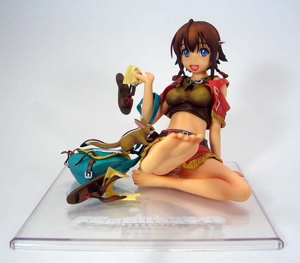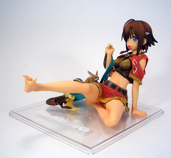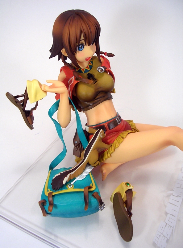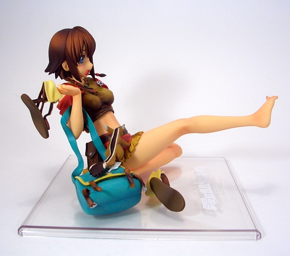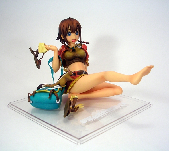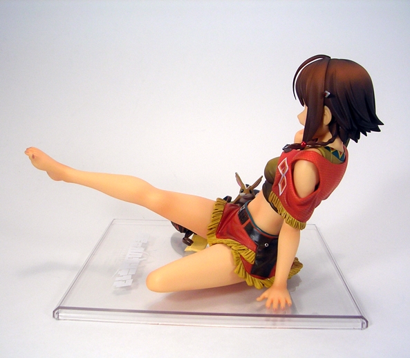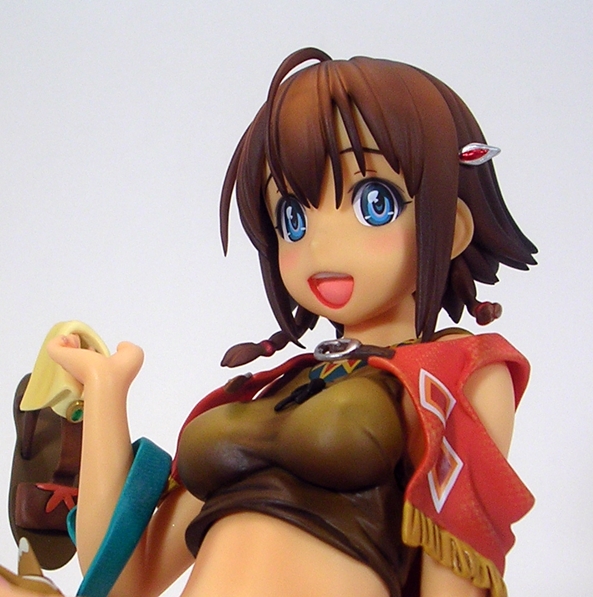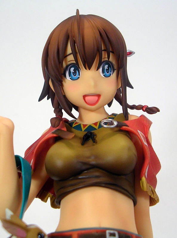 Unconventional pose or not, both the detail and coloring on this piece are absolutely fantastic. They did an amazing job with her outfit, particularly with the rumpling of her skirt and top and her little half-jacket is crafted in soft plastic and is removable. Even the skirt is crafted as a separate piece and laid onto the figure, albeit it isn’t removable. The belts and buckles are very neatly painted as are the aboriginal patterns decorating her clothing. The soft nature of the paintwork on the outfit along with the lightly tanned skin tones gives the statue a warm and pleasing look that replicates the tropical nature of the anime artwork quite well.