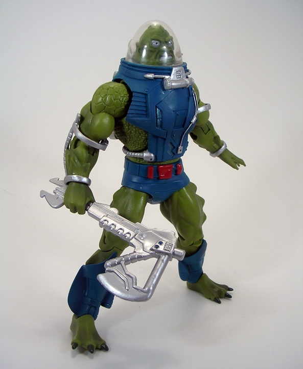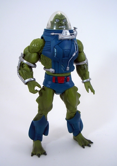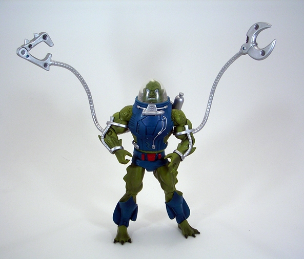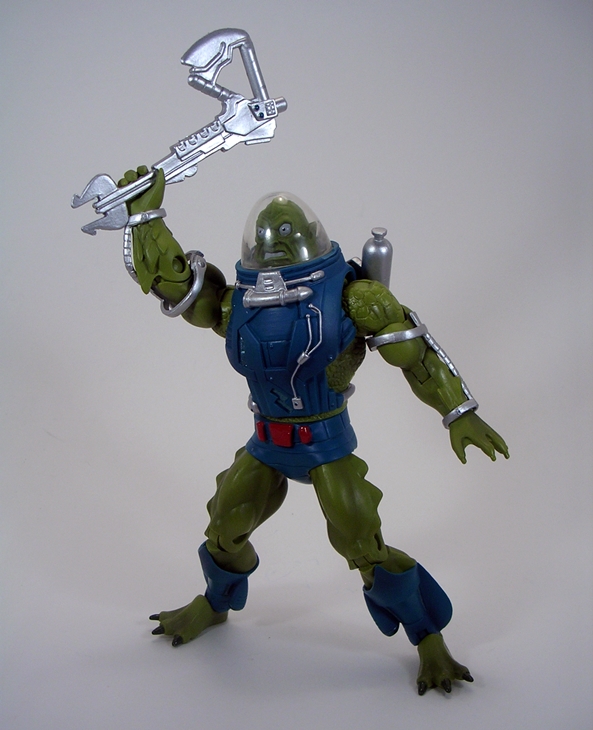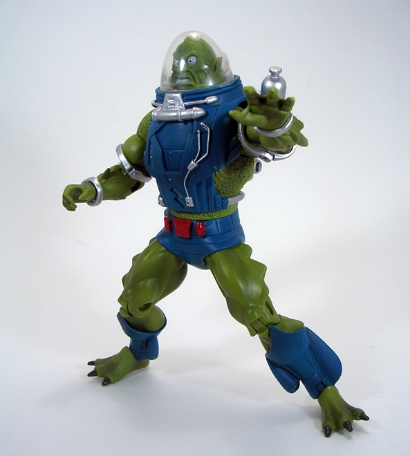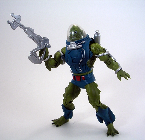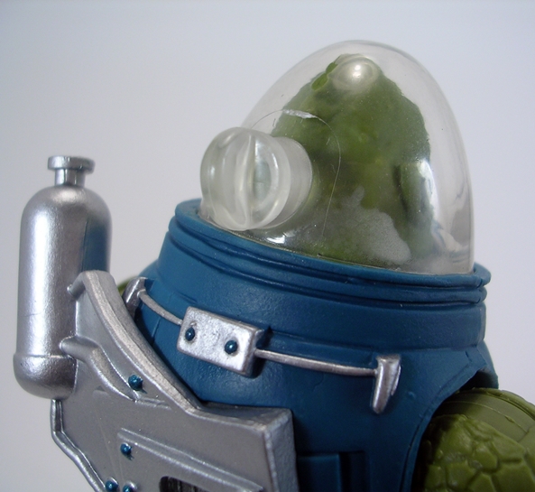 I have to confess, I love the idea of a reverse diving suit. That is to say, a suit that is full of water so that an aquatic creature can walk around on dry land. You don’t see it too often, and maybe that’s why I still find it bizarre and original. Slush Head is wearing just such an apparatus that allows him to keep breathing in that stanky swamp water while hob-nobbing with us air breathers. His suit consists of a vest with a metallic back pack and the clear dome. There’s even a removable plug on the back of the dome if you want to actually fill it with some kind of liquid. The side of the package even encourages you to do this because it’s fun. Well, you convinced me! I live in Florida, so it shouldn’t be hard to find some authentic swamp water. The suit is rounded out by a pair of lower leggings with fins and what appear to be propulsion jets.