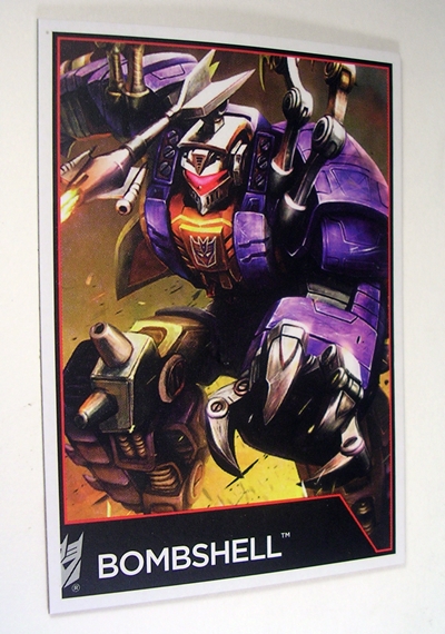 Inside the package you get the usual folded instruction sheet, but you also get this nifty art card. I actually really dig these. I still have all the art cards that came with my Armada figures. What I don’t dig is the new way Hasbro is securing these figures to the packages. God, these little plastic straps are terrible. What was wrong with the elastic bands? Or the string? I mean they’re not as bad as the old wire twist-ties, but I don’t like them at all. Anyway, Bombshell comes packaged in his robot mode, so I’m going to go ahead and start with that.