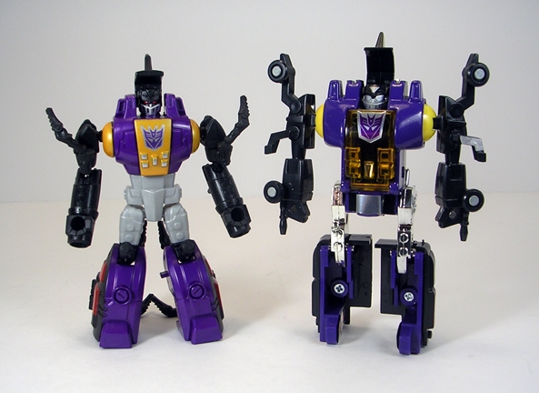 I’m not a big fan of the bare grey plastic used for his crotchular region or his thighs, but the sumptuous metallic purple and goldish-yellow paint more than makes up for it. Throw in the black and some red painted panels on the sides of his legs and you have one striking Decepticon deco. Black and purple… you can’t go wrong with that if you’re a ‘Con.