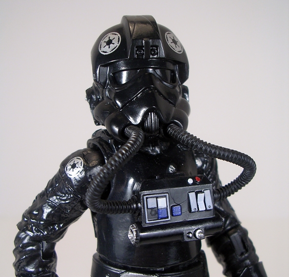 I’ve always loved the designs of these guys because they look so sinister. The Tie Pilot features a sculpted black flight suit with all the appropriate stitching and rumples. The breathing apparatus mounted to the front of his vest includes two flexible tubes that run into his mask, which resembles a Stormtrooper wearing a flight helmet. I think Hasbro did a great job on the helmet sculpt. It looks spot-on perfect to me. The tubes are removable from the helmet, but thankfully don’t pop out too easily when I’m posing him. The detailing on the life support panel is well done and features some very clean paintwork.