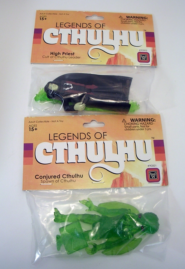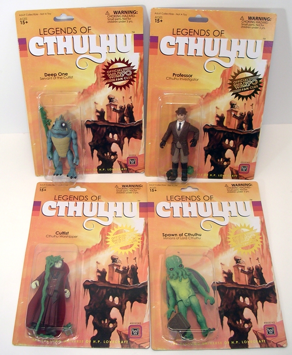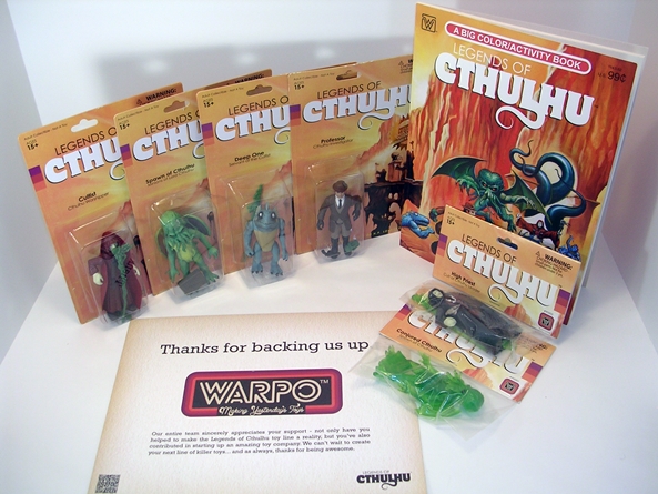 The Summer of 2014 was a big one for toy-related kickstarters. I backed three of them, and while two are facing delays in production and distribution (these things happen), the folks at Warpo were able to get their offerings out in a pretty timely manner. The Legends of Cthulhu is a line of retro-style action figures based on the enduring writings of H.P. Lovecraft. I started reading Lovecraft about the time I was in Junior High. I couldn’t tell you the first story I read, but I’m positive it was one of the Dream Cycle stories and I was instantly hooked by his fleeting descriptions of other worldly dimensions, alien landscapes, forbidden cities, and ancient and bizarre gods. To this day I keep a couple of well-worn paperback copies of his short stories in my nightstand for when I’m up for a little easy reading before bedtime. But why have there never been any proper Lovecraftian action figures? Where were the likes of Kenner, Mattel or LJN? One might as well try to gleen the true shape of Ycnàgnnisssz than understand why the toy companies of the 80’s had no such offerings. The closest we probably ever came were The Inhumanoids. Well, nearly 30 years later I can rejoice for they have arrived as if plucked straight out of the early 80’s and delivered to my doorstep through the shades of time itself. Today I’m going to look at the packaging and some of the other backer incentives and tomorrow I’m going to… <gulp> open these up and check out the figures. Probably. I mean, I really shouldn’t. They look so nice in the packages. But I really want to…