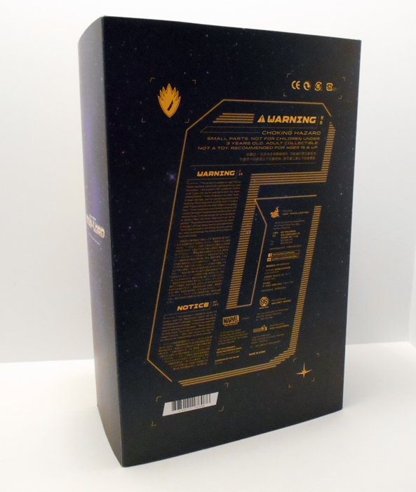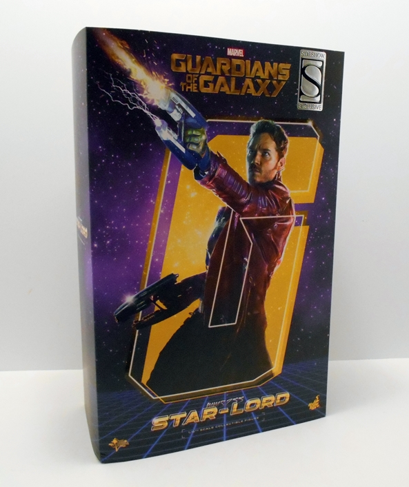 The box design is totally out there and very unlike anything I’ve seen in my rather modest few years as a Hot Toys collector. You get a colorful action shot of Star-Lord on the front with an 80’s style grid on the bottom and some really cheesy looking effects. It feels more like the box art for a late 80’s PC Game than an expensive collectible figure. I’d like to presume that Hot Toys went this route to intentionally bank on the film’s goofball nature, but I’m not really sure. It certainly looks quite jarring next to the classy and reserved presentation of their other Marvel figures, but I can’t say I hate it. Hot Toys also seems to have cut back on the box itself. Instead of the old shoe-box style with illustrated insert, this is just a sleeve around a window box. Some may take issue, but I just keep the boxes for accessory storage, so I’m not terribly upset by it. Oh yeah, the box also has the “Sideshow Exclusive” foil sticker on the front and in this case that amounts to an extra accessory.