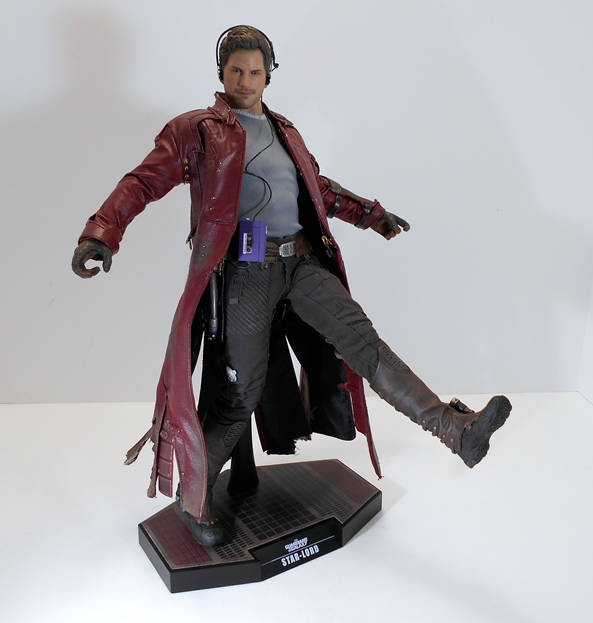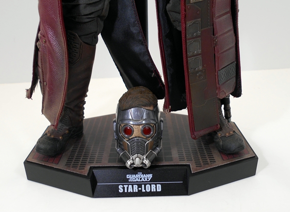 Of course, every Hot Toys figure comes with a stand and in this case, they have cast off the standard oval black stand that we’ve been seeing with most of the Marvel figures for something a little more movie specific. The larger seven-sided base is surfaced to look like the deck plating of a spaceship with an angled nameplate in front with Star-Lord’s name and the title of the flick. One of those bendy flight style stands would have been cool, but I like this one a lot. It feels a little more premium than what we’re used to getting and I like that all the figures from this film are going to have matching stands.