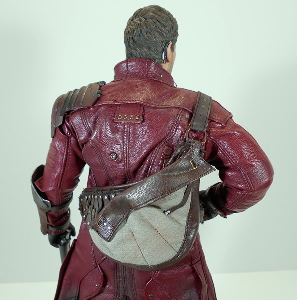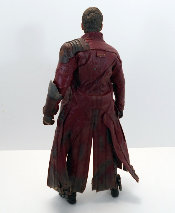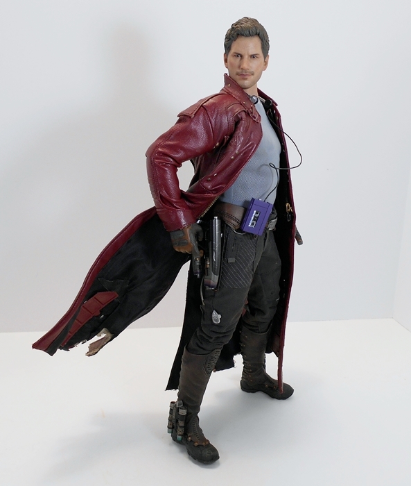 Once I had carefully cut away some of the plastic wrap, Star-Lord came out of the box and was ready for action. His jacket and gun belt are already on and he’s sporting his unmasked head. I’m used to having to fuss with my newly opened Hot Toys figures, but in this case it’s impressive how everything looks so good right out of the box. The t-shirt fits well and the pants have some really nicely stitched detail work, but it’s the coat (RAVENGER GARB!) that is truly the star of this A-Hole’s outfit. There are so many little brass buttons and hooks and embossed patterns littered over the leather-like surface that it only takes one look to know that Hot Toys put some love into this coat, but a lot more intensive study to truly appreciate it. The coat even has a working zipper should you like to go that route. It’s nice to have options, but I dig the look of the open coat so much, I doubt I’ll ever bother with zipping it. And quite frankly, I have bad luck with 1:1 scale zippers, I don’t want to turn myself loose on a 1:6 scale zipper on a $230 collectible figure. The armor pieces are present on his left arm and shoulder, and the bottom of the coat is frayed and tattered and even shows places where Quill has made crude repairs. Speaking of repairs, I should note that while handling the figure one of the dozens of buttons on my figure’s jacket popped off. By some miracle I managed to find the tiny thing and glue it back on, easy-peasy, but it’s certainly something to look out for. Hot Toys actually included extra buttons with Winter Soldier’s tunic, but that isn’t the case here, so be mindful of your buttons! Some could fall off and never be missed, but others could be pretty conspicuous.