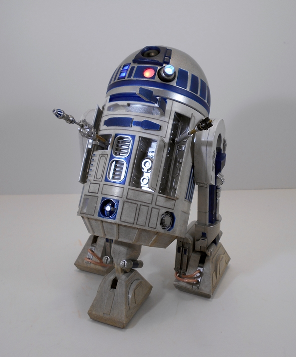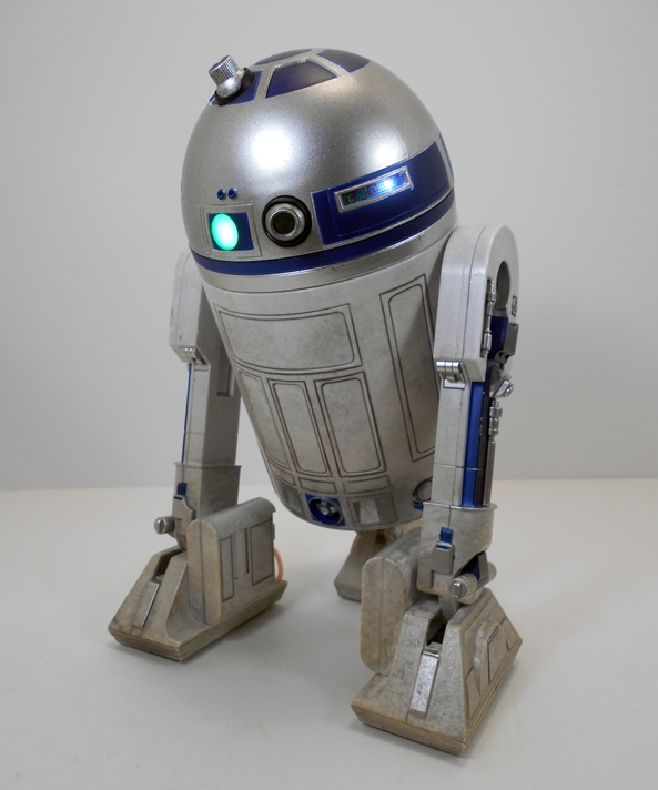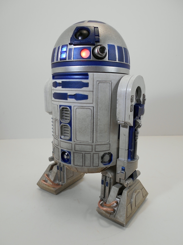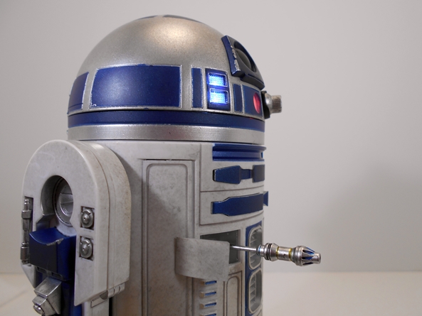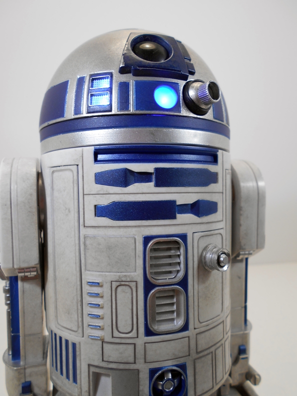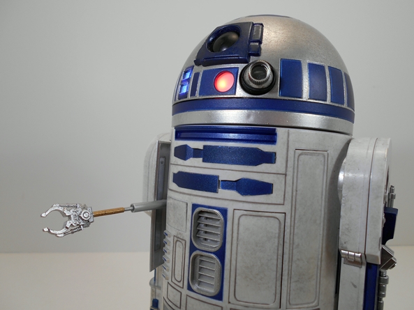 While he looks fantastic, getting R2 in hand gave me pause, as this is a pretty light figure and some might say flimsy feeling figure. There’s no die-cast to give him any heft and it’s obvious that he’s mostly hollow. He’s priced like a high end collectible, but he feels more like a toy, and a delicate one at that, especially as you begin to open his hatches and mess around with his features. Granted, for me value doesn’t have to equate with weight, but I know a number of collectors have been voicing unrest over some of the recent light weight Premium Format statues by Sideshow and this R2 presents a similar case. On the other hand, it’s probably a good thing the body isn’t any heavier because there’s a little play in his ankle joints and you have to balance him just right when standing on only two legs or he’s likely to lean forward or back. The shoulder joints, on the other hand, are nice and snug. R2 also features the retractable third leg. You can deploy it simply by pushing in on it and it will spring out. Push it back up and it will lock into place. All three feet have wheels on the bottom and R2 rolls splendidly across my desk, buy hopefully never off my shelf.
