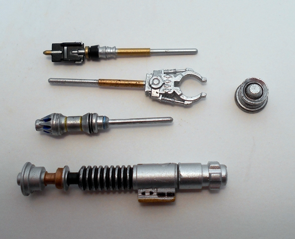 Alrighty, so let’s talk hatches and attachments and we’ll start with the body. R2 comes with Luke’s lightsaber hilt and there’s a magnet in it so you can use it to open all of R2’s chest panels. I love this feature as (most of the time) it prevents you from having to dig these open with your nail and risk damaging anything. Yes, the hinges appear very fragile, and while I did have one door come off entirely, it was easy to put back on. The two horizontal blue actuator arms swing out. The door to the left of the central vents (R2’s left) opens to reveal some sculpted and painted mechanisms. The panel to the right of the vents opens to reveal a socket to insert one of his arm attachments. The two long side panels each open and reveal swing out arms to plug in arm atachments too. Getting these arms to swing out can be a bit of a chore, but once you do they are designed to travel up and down a rail to change their height, which is a pretty cool feature. All the doors can open at once and if you got the regular retail edition (Sideshow’s Exclusive came with an extra saw blade) you can have all the included arms deployed at once. The arm attachments include his zapper, his computer interface, and his grabber arm. These arms just socket into the holes, although some don’t really stick and can be knocked out very easily. And yes, while some of these features are delicate, I still think they were done quite well.