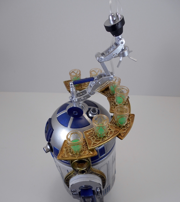The final feature on the dome is the rather elaborate serving tray and arm that was used by the little droid on Jabba’s Sail Barge. The serving arm hatch is opened with the lightsaber magnet and then you just peg the arm into place. The tray requires you to peg in the side pieces, which is a precarious undertaking since each level of the drink tray is secured by two rather weak posts. I can easily see these bending and snapping when applying the force needed to get those sidepieces on or taking them off to put everything back in the tray. After that you just peg in the drink cups. Once assembled, the whole thing rests very securely on R2’s shoulders and looks pretty damn great. The serving arm will rotate 360-degrees and it’s hinged in several places. I like this thing a lot, but I can’t see myself using it for display all that often.