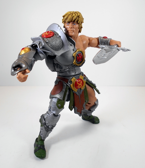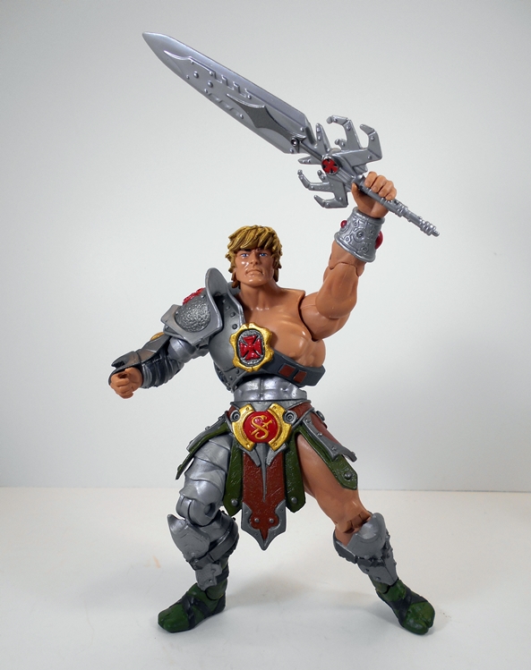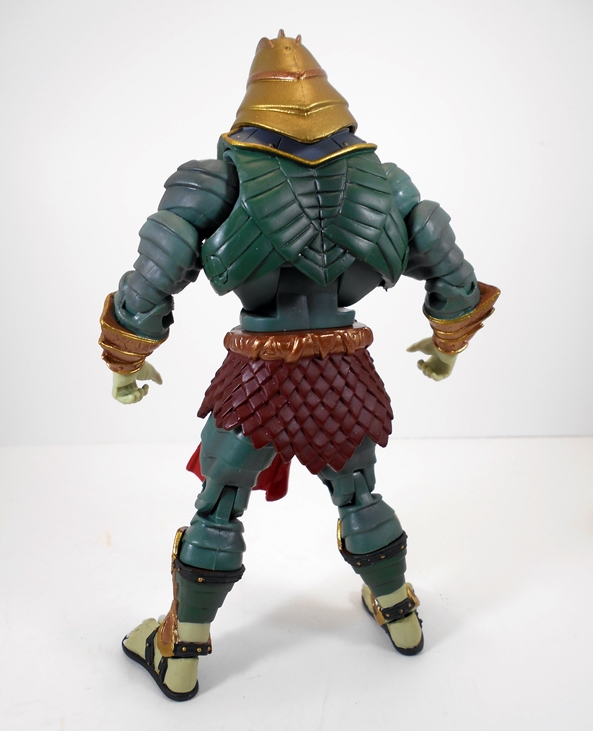 As someone who was not a big fan of the whole themed variants concept that ran amok in the 200x line I still have to say that I am in love with this armor. Snake Armor? Pfft… don’t care what kind of armor it is, it just looks absolutely bitchin’. I get a little medieval vibe off of it in the legs, and a major gladiator feeling off the shoulder piece. I also really dig that it keeps the He crest and at least one of the cross straps to maintain the flavor of He-Man’s iconic design. And yeah, you also get the snake and sword emblem just in case the whole Snake Armor thing is something that you do care about. Besides the overall design, the sculpt is just packed with detail. The “skirt” strips are textured to look like leather, the shoulder guard has a great hammered finish to it, and there are little cracks and dings here and here to make it all look a little battle weathered. Everything about the execution of the armor from sculpt to paint is just solid work. I also love what they did with the colors. The red, gold, and green really make the figure pop.