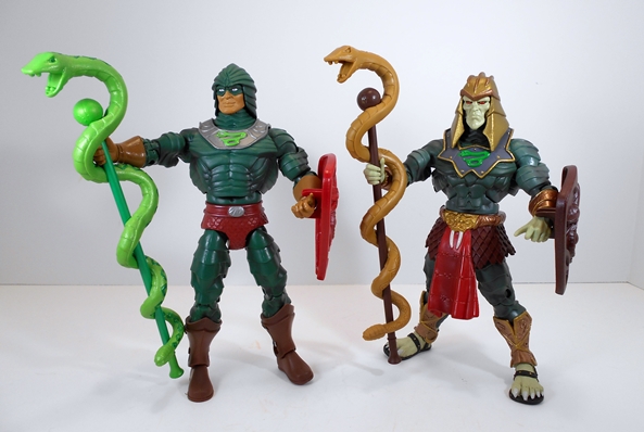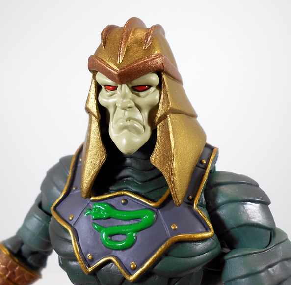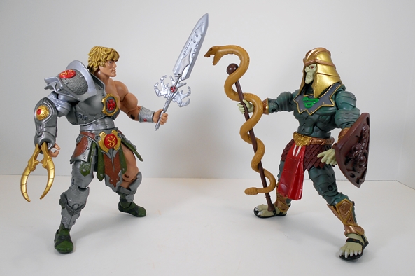And that brings us to King Hssss. I can’t even begin to recount how much more I like his MYP design over the more Classic one. Is that sacrilege? I don’t know, nor do I care. This new version has more of a regal look to it, like an ancient Babylonian King and I think it really suits the character well. The segmented armor and scaled sash drive the snake motif home really well and man do I dig that gold belt with the sculpted snake face and fangs coming down over the red sash. Even the paintwork on his gorget, with the gold fringe and green snake emblem, is just beautifully done. Oh yeah, he also has Predator feet and sandals! As with He-Man, I really dig the coloring on this figure as well, particularly that gorgeous crimson paint they used on his sash.