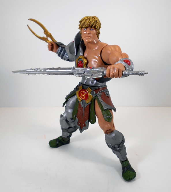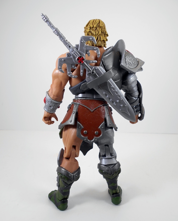 He-Man comes with two accessories: A pincer claw for his right gauntlet and his Power Sword. The sword is the same basic piece that came packed with Man-At-Arms waaaay back when. It may have a different paint job, but it looks quite similar to me. I was never a huge fan of this sword design, it’s probably one of my least favorite things about the MYP series, but I’m still glad he came with it and he can sling it on his back thanks to a carry strap in the armor.